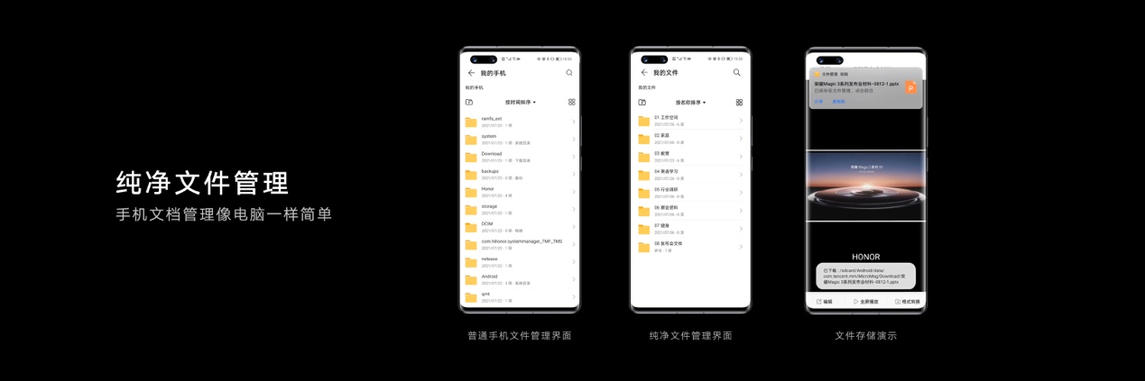 为了帮助事务繁多的商务人士更高效管理个人事务,荣耀还与各办公平台合作,让用户在钉钉、飞书、Welink、WPS办公平台的日程均能通过荣耀Magic3系列进行统一管理。而新增的纯净文件管理系统(此功能后续通过OTA升级支持),则使荣耀Magic3系列在文件保存和管理方面进行进一步简化,让手机文件管理从此可以像电脑一样简单便捷。