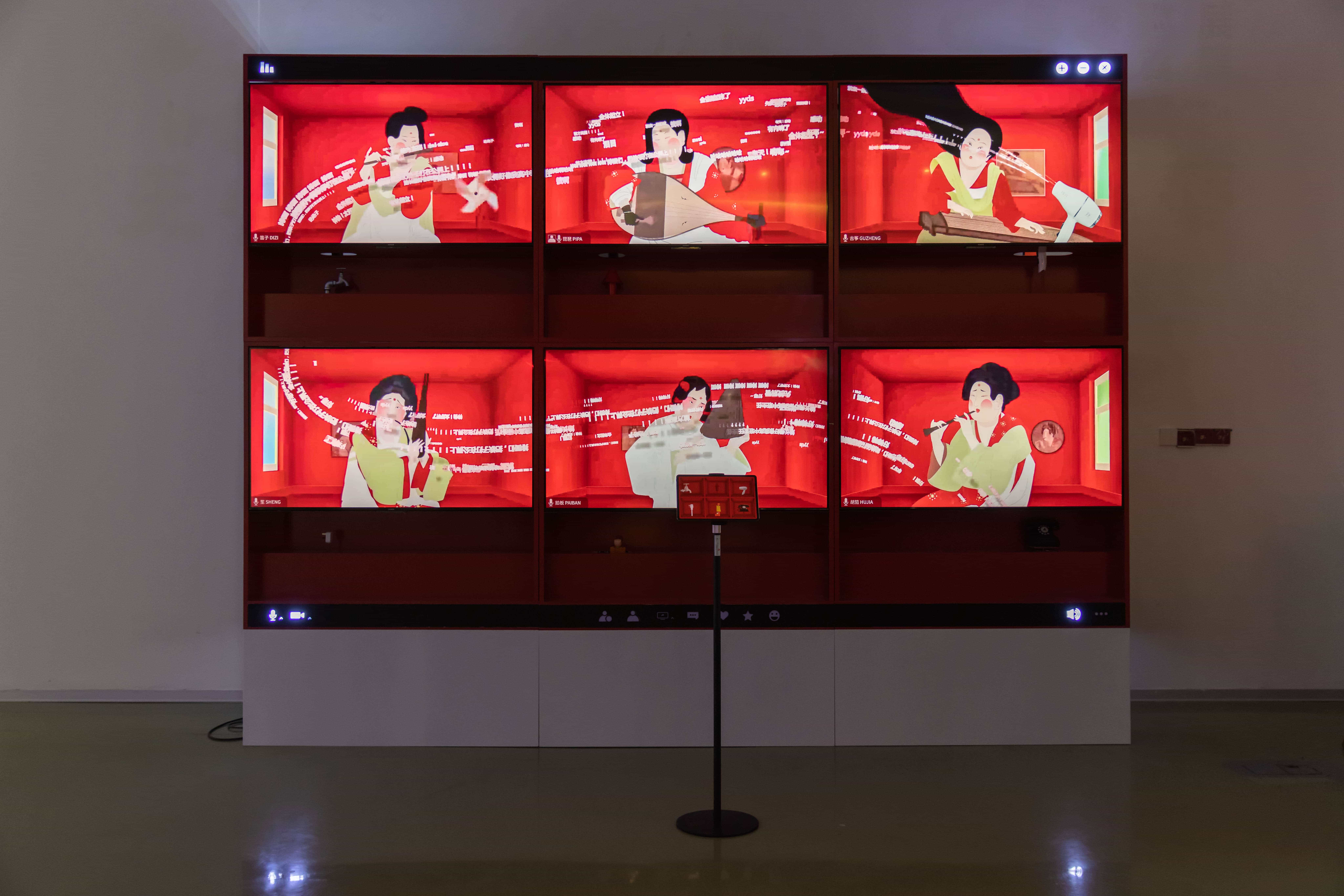 为保障《合奏》能够切实落地并完整传达作者设计原意,荣耀结合智慧屏与平板电脑产品,创新采用了六联屏机械交互的设计,通过荣耀平板电脑触发激活物理装置联动影像,将体验者带入虛拟混维空间。在这种巧思设计与创新技术的支持下,观众可沉浸式地与屏幕画面中的六位仕女进行互动,感受她们在面对水淹、电击、风吹、烟熏、火烤、爆瓜六大危机时的乐观精神,品味她们奏响应对危机的东方当代乐曲。