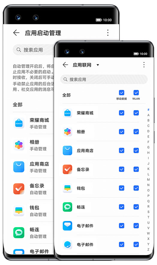 我们提供了单个应用访问网络方式(移动数据或WLAN)的设置功能,防止应用在未经允许的情况下通过网络进行收集和传输数据;我们提供了单个应用启动方式(自启动、关联启动或者允许后台活动)的管理功能,限制应用在你无感知的情况下自动运行,降低个人信息泄露的风险。同时我们通过智能化的应用启动管理,自动识别应用和使用场景,限制不必要的