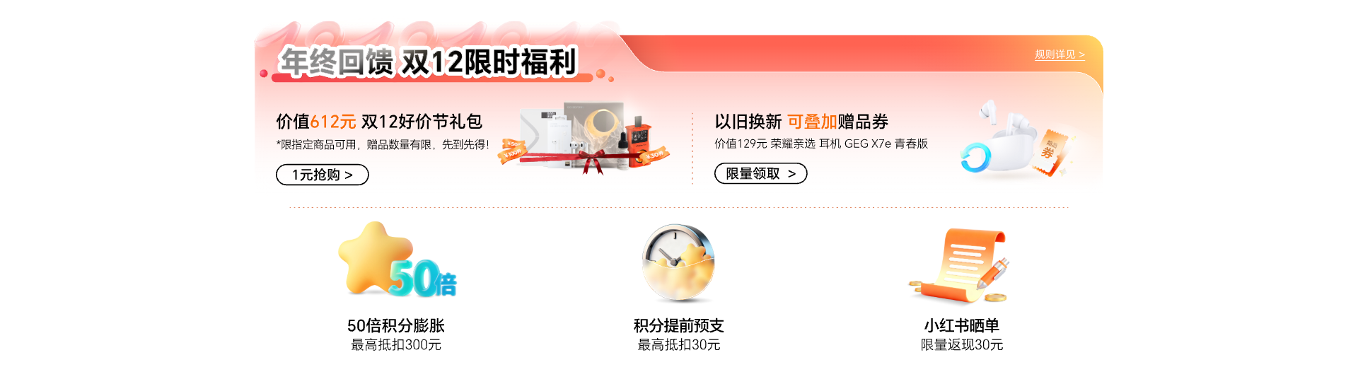 4、奖品发放:用户参与抽奖完毕后即在本抽奖活动页面被告知抽奖结果。实物中奖用户将会收到消息通知,PC端的查看路径:在我的账号>消息中心>活动消息;手机端的查看路径为:点击荣耀商城APP端首页搜索栏右侧的小图标,进入消息中心,查看活动消息,或者进入商城>我的>右上角消息中心。优惠券将在购买15分钟内发至用户账户,请在荣耀商城-我的-优惠券中查看,优惠券具体的使用规则和限制详见券面说明,可使用优惠券的商品见券面“去使用”商品列表。抽中实物奖品用户请于2025年12月31日前到“个人中心-收货地址管理”中设置默认收货地址,实物奖品将在活动结束后30个工作日内按照您的默认收货地址发货,具体版本/制式/颜色请以收到的实物为准。