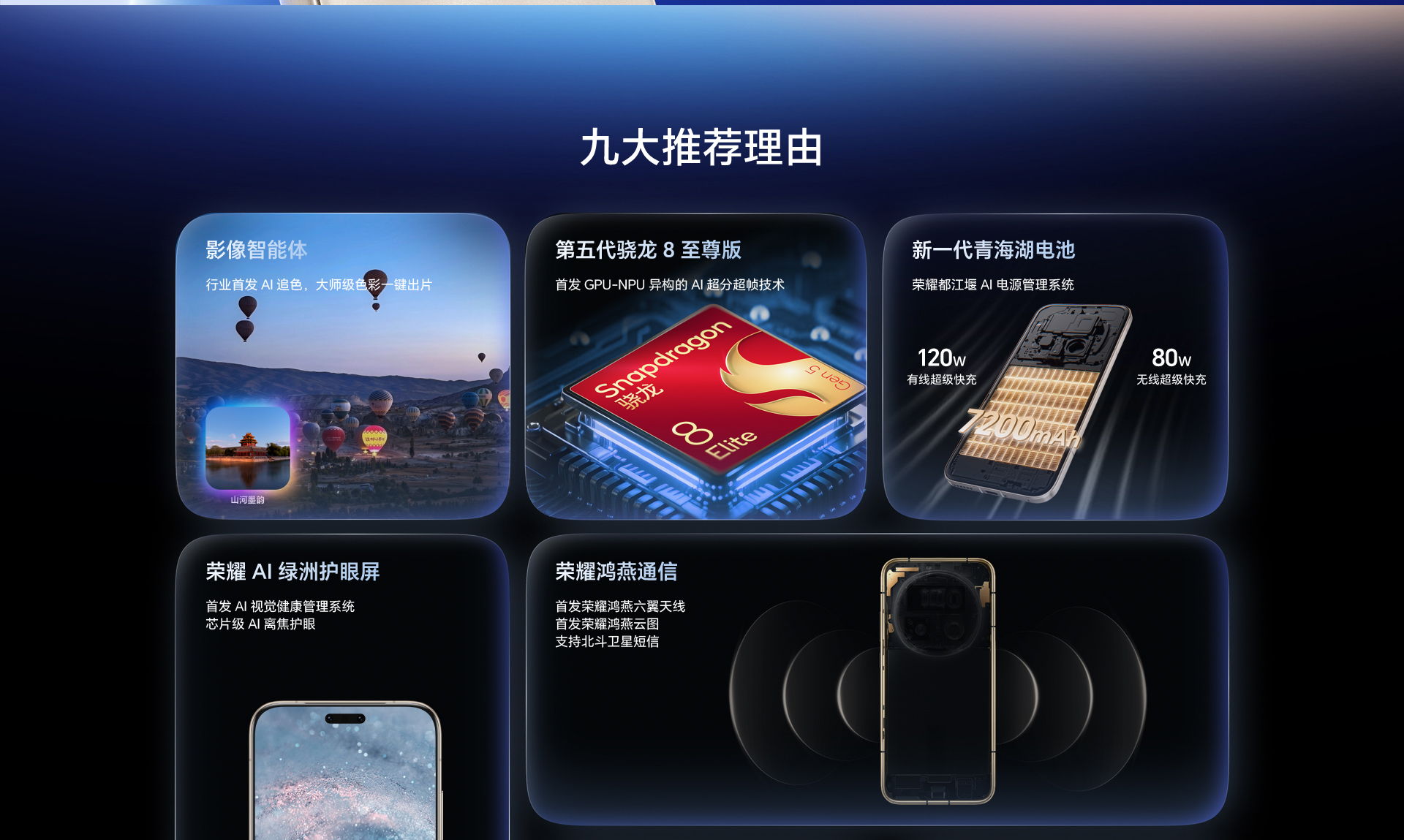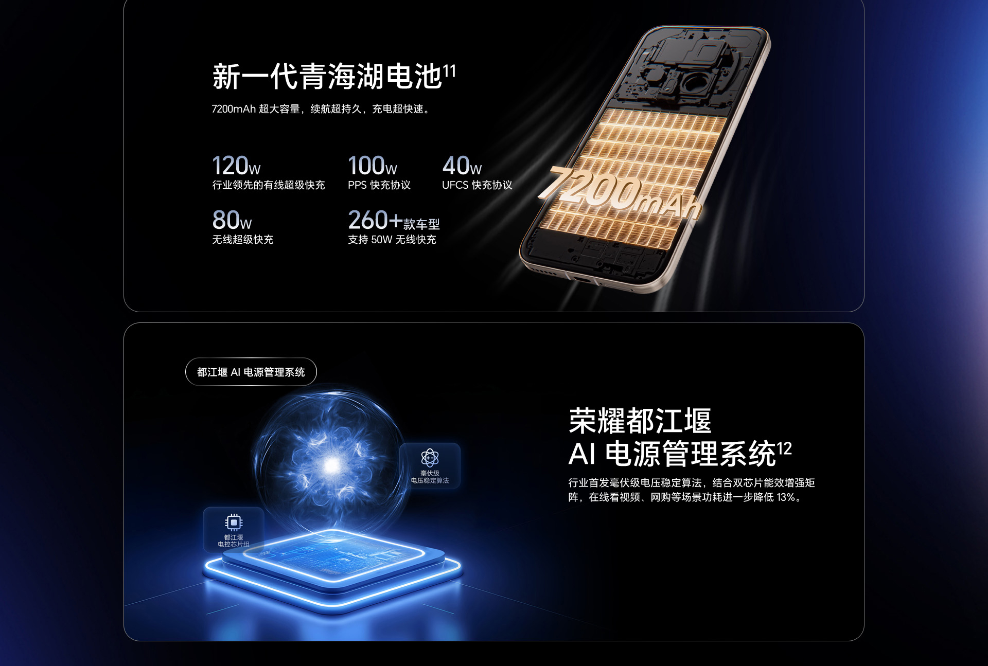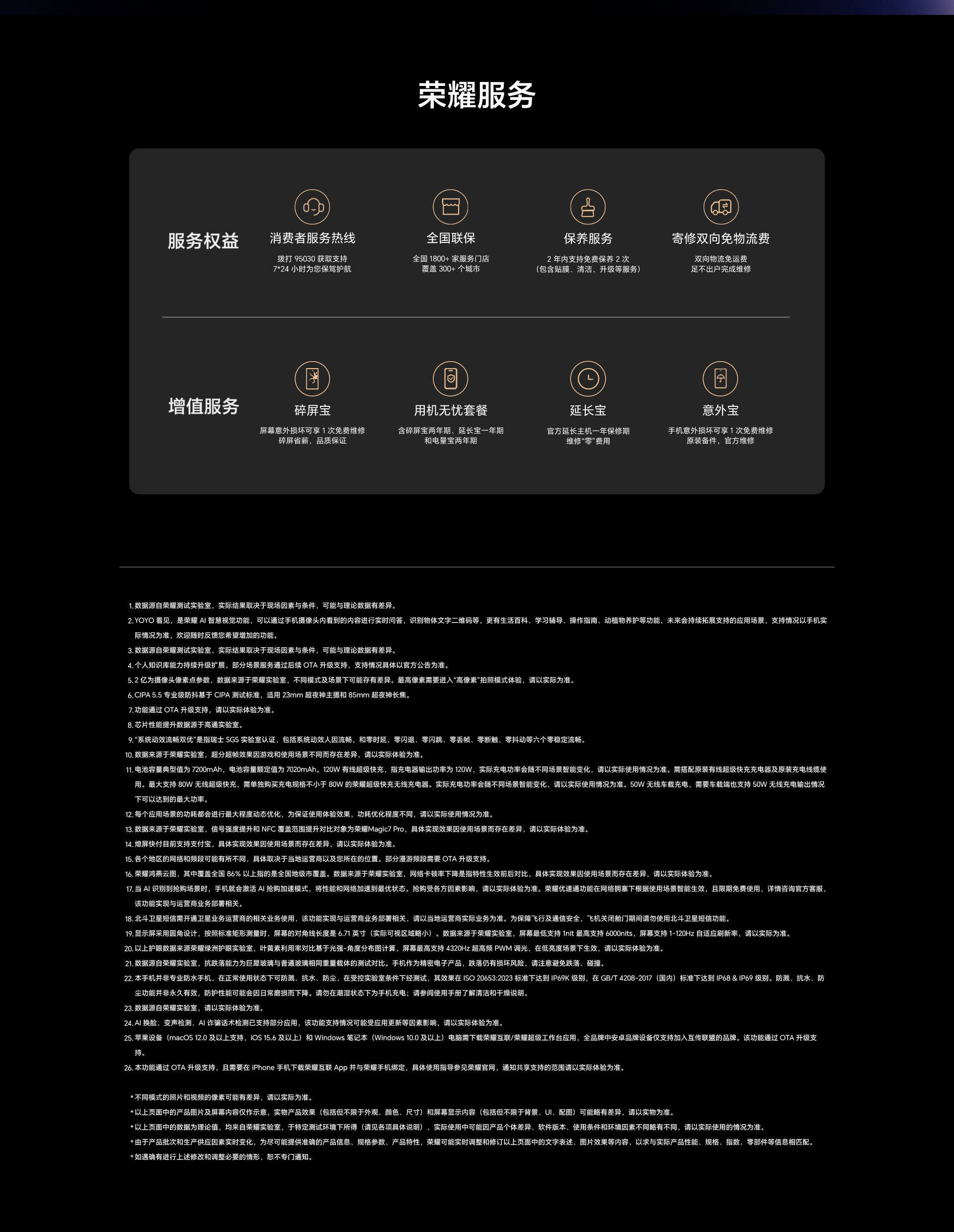 *以上页面中的数据为理论值,均来自荣耀内部实验室,于特定测试环境下所得(请见各项具体说明),实际使用中可能因产品个体差异、软件版本、使用条件和环境因素不同略有不同,请以实际使用的情况为准。