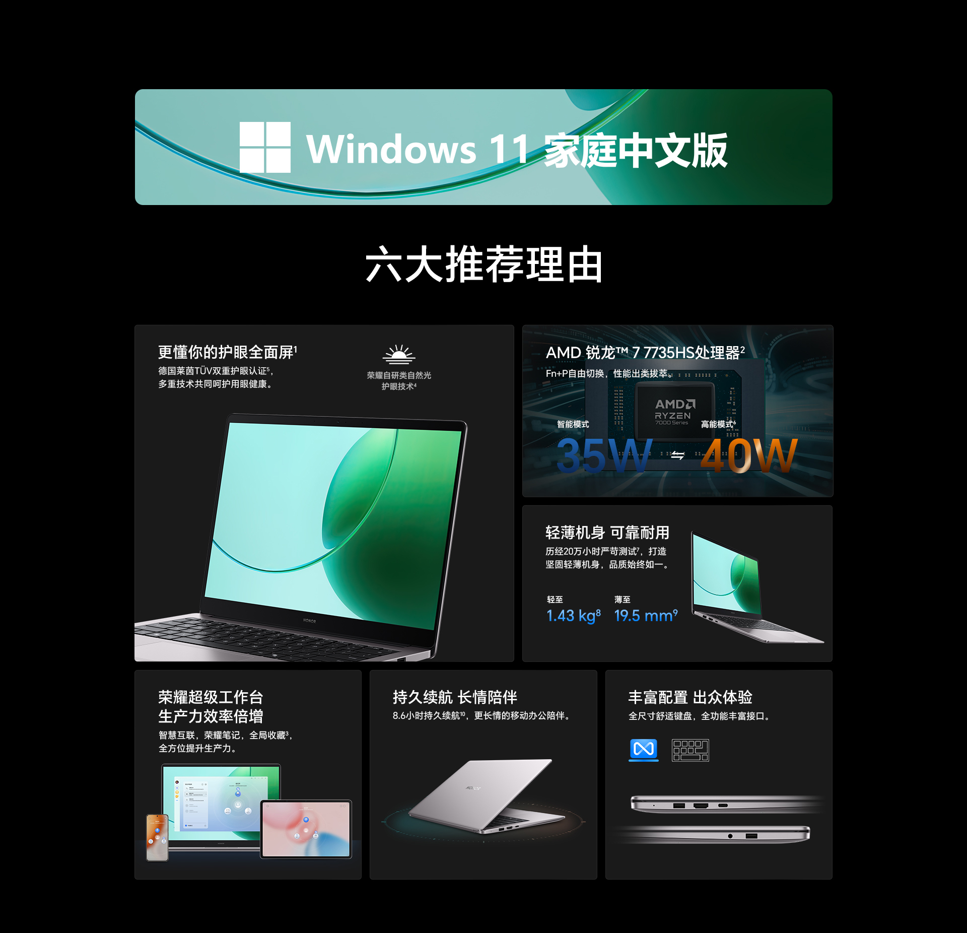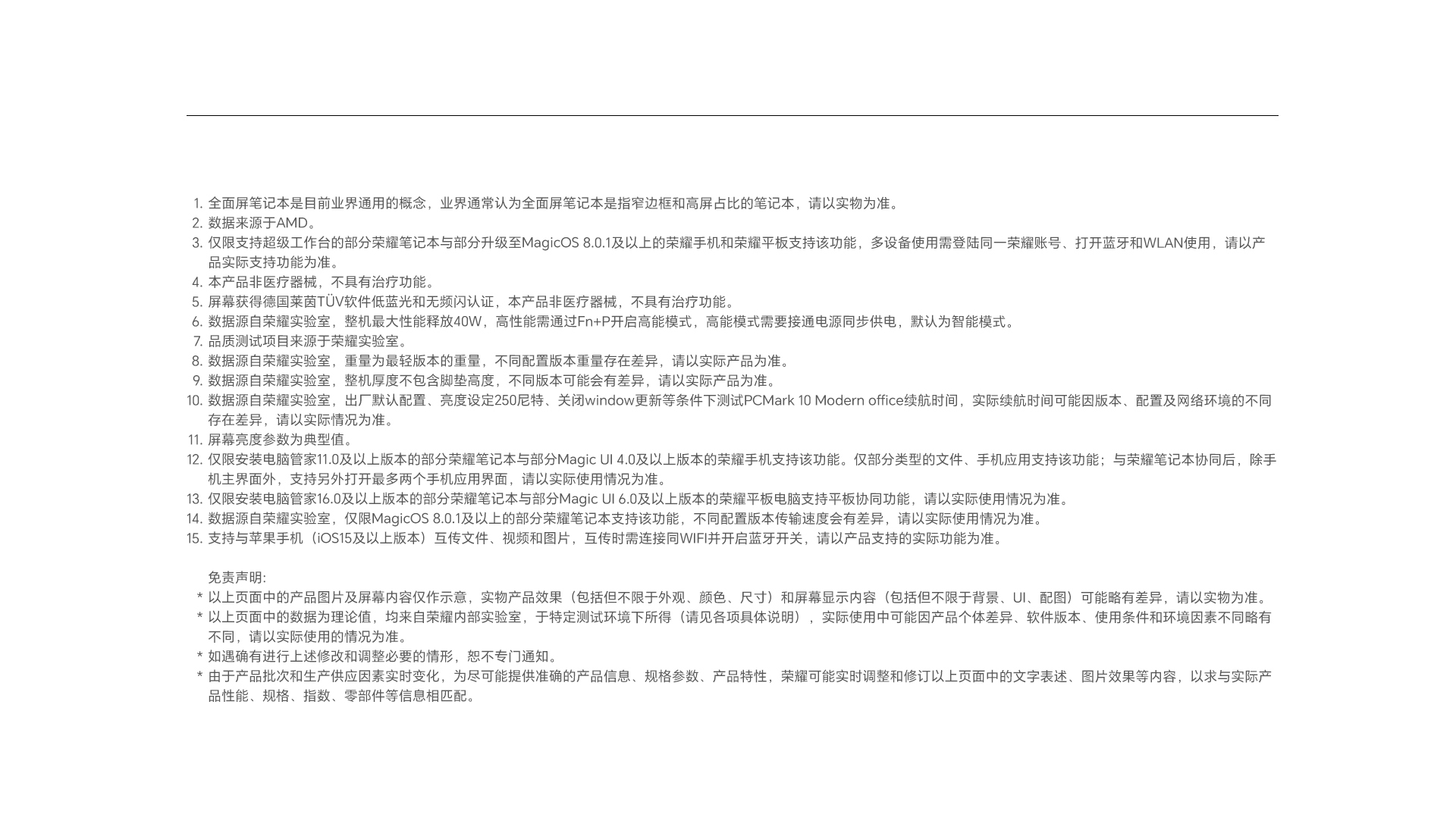 *以上页面中的数据为理论值,均来自荣耀内部实验室,于特定测试环境下所得(请见各项具体说明),实际使用中可能因产品个体差异、软件版本、使用条件和环境因素不同略有不同,请以实际使用的情况为准。