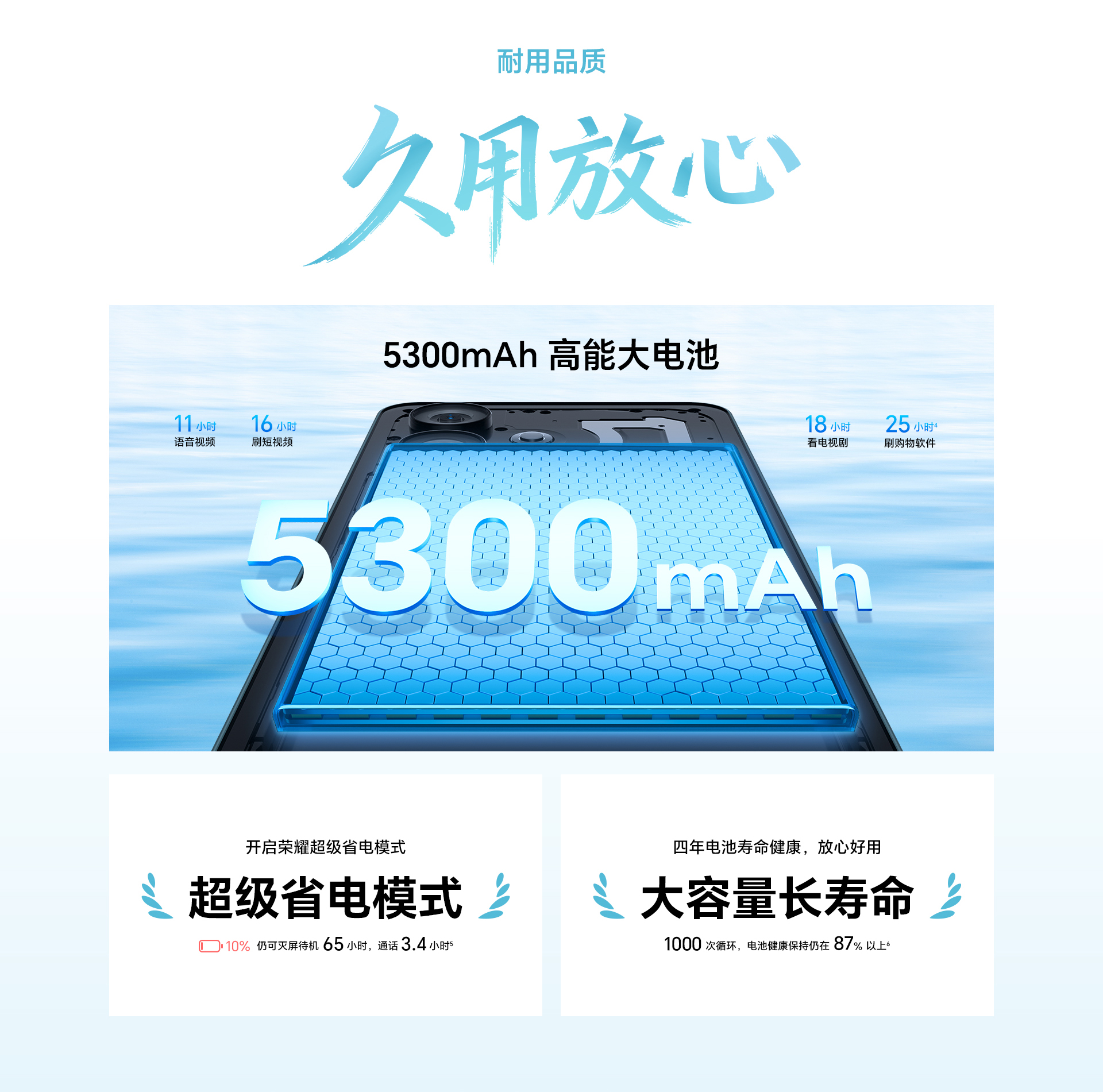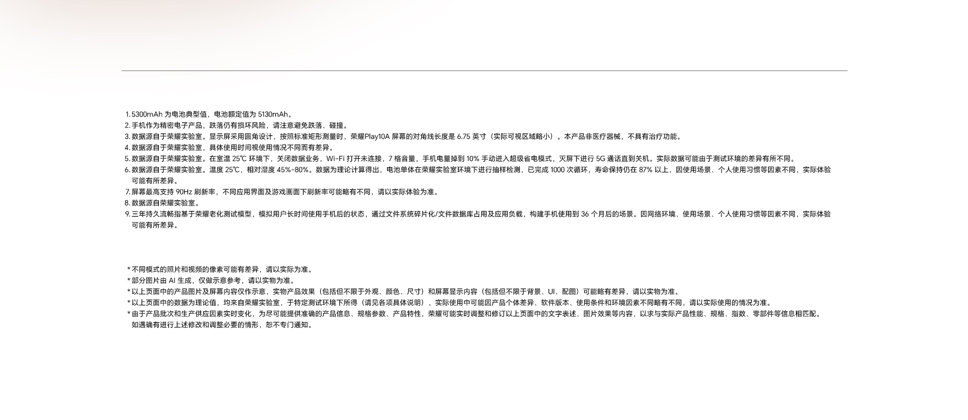 *以上页面中的数据为理论值,均来自荣耀内部实验室,于特定测试环境下所得(请见各项具体说明),实际使用中可能因产品个体差异、软件版本、使用条件和环境因素不同略有不同,请以实际使用的情况为准。