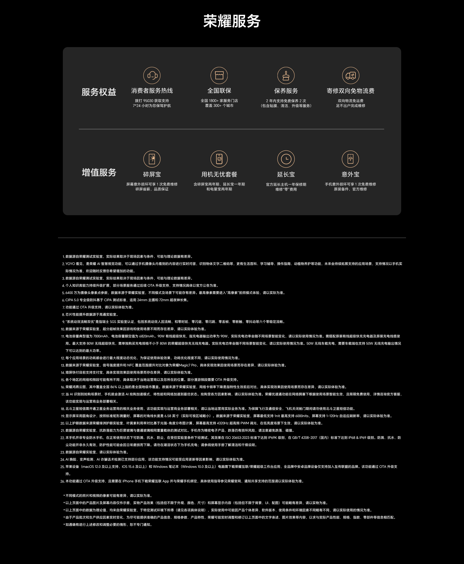 *为提供尽可能准确的产品信息、规格参数、产品特性,荣耀可能实时调整和修订以上页面中的文字表述、图片效果等内容,以求与实际产品性能、规格、指数、零部件等信息相匹配,由于产品批次和生产供应因素实时变化,如遇确有进行上述修改和调整必要的情形,恕不专门通知。