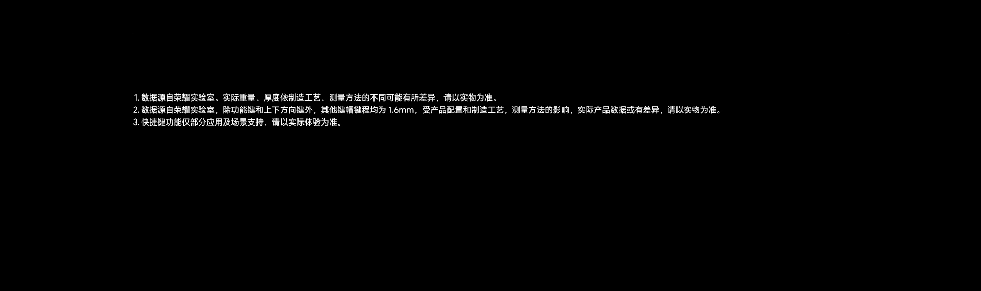 *以上页面中的数据为理论值,均来自荣耀内部实验室,于特定测试环境下所得(请见各项具体说明),实际使用中可能因产品个体差异、软件版本、使用条件和环境因素不同略有不同,请以实际使用的情况为准。