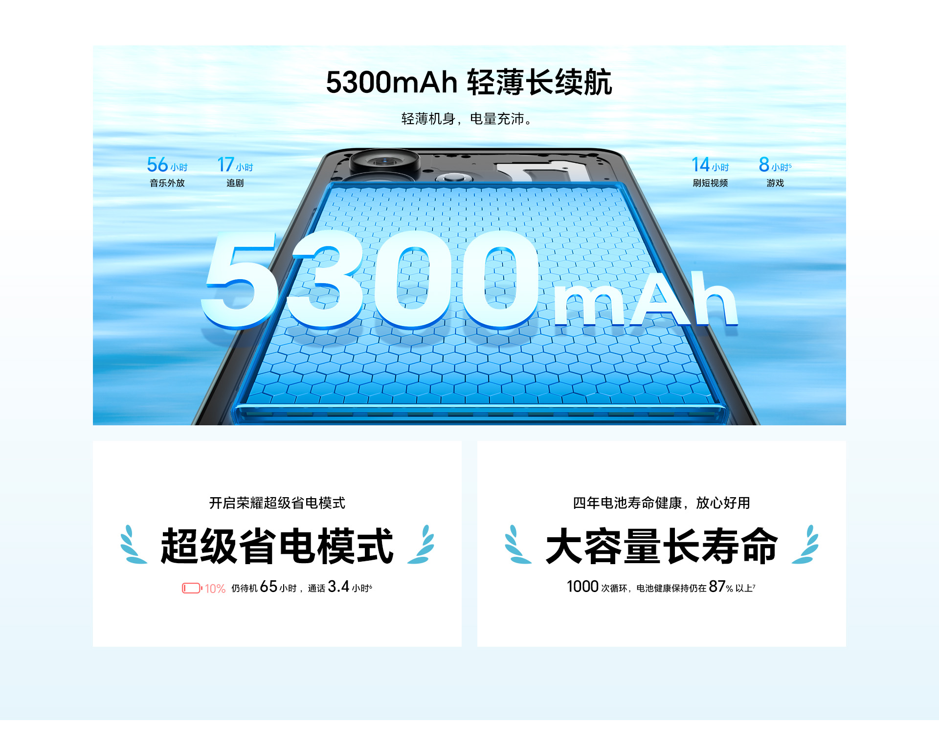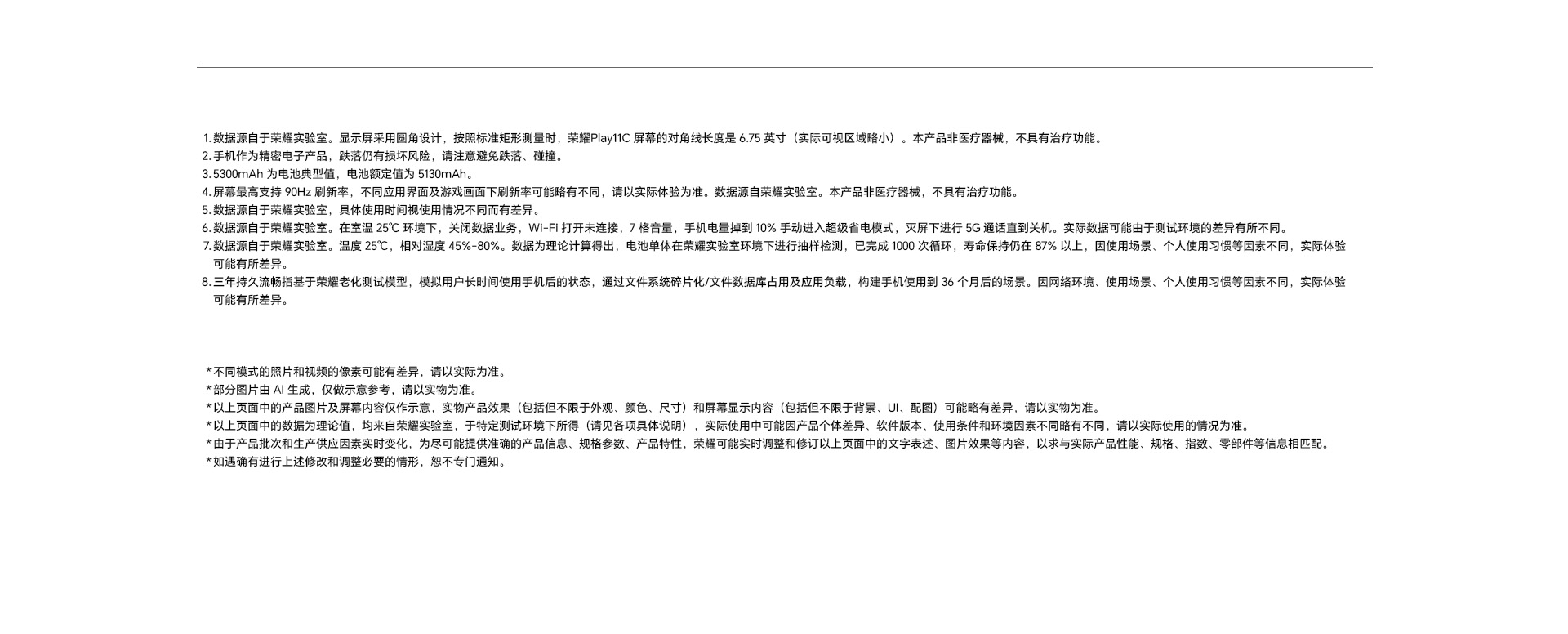 *以上页面中的数据为理论值,均来自荣耀内部实验室,于特定测试环境下所得(请见各项具体说明),实际使用中可能因产品个体差异、软件版本、使用条件和环境因素不同略有不同,请以实际使用的情况为准。