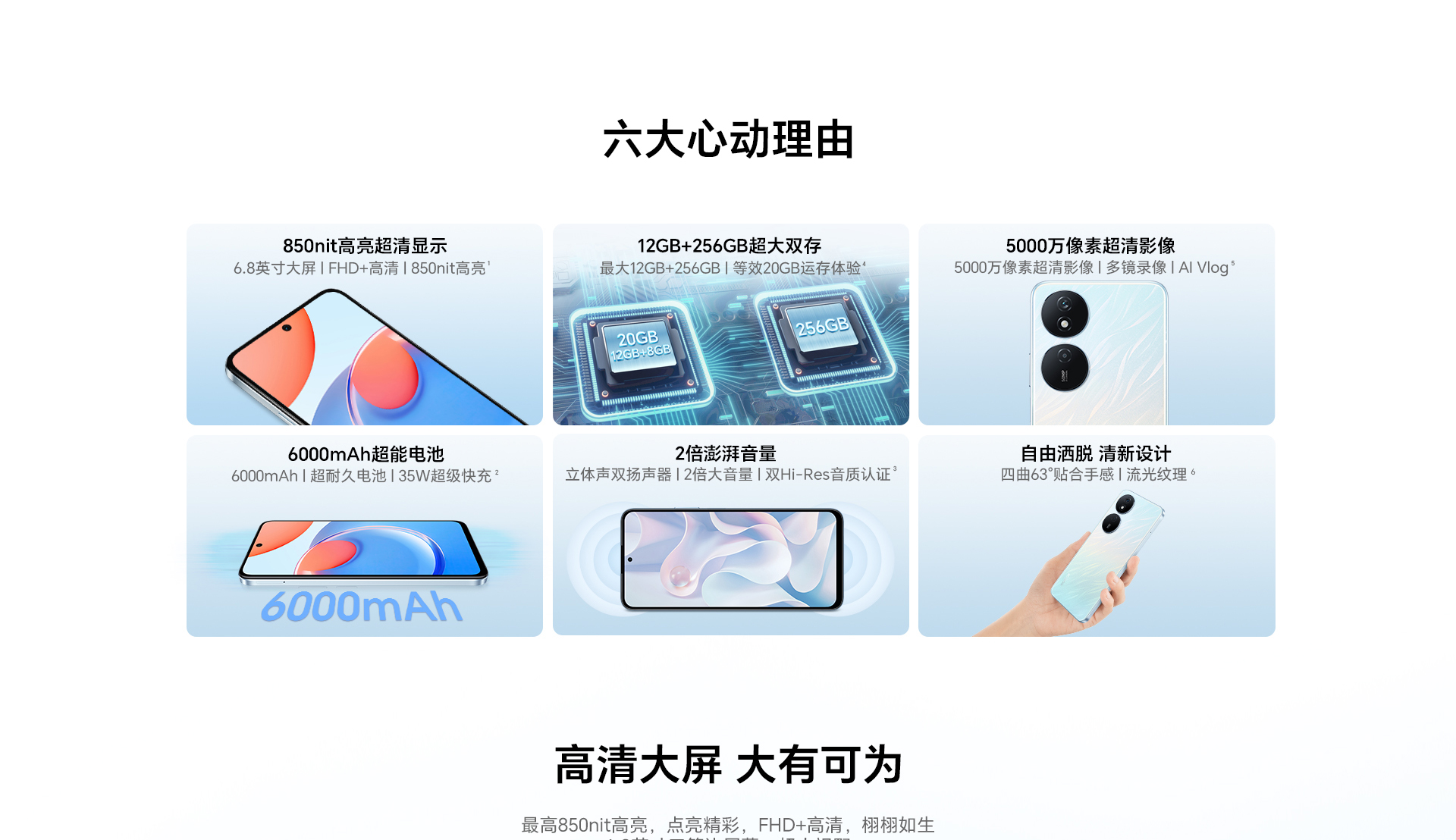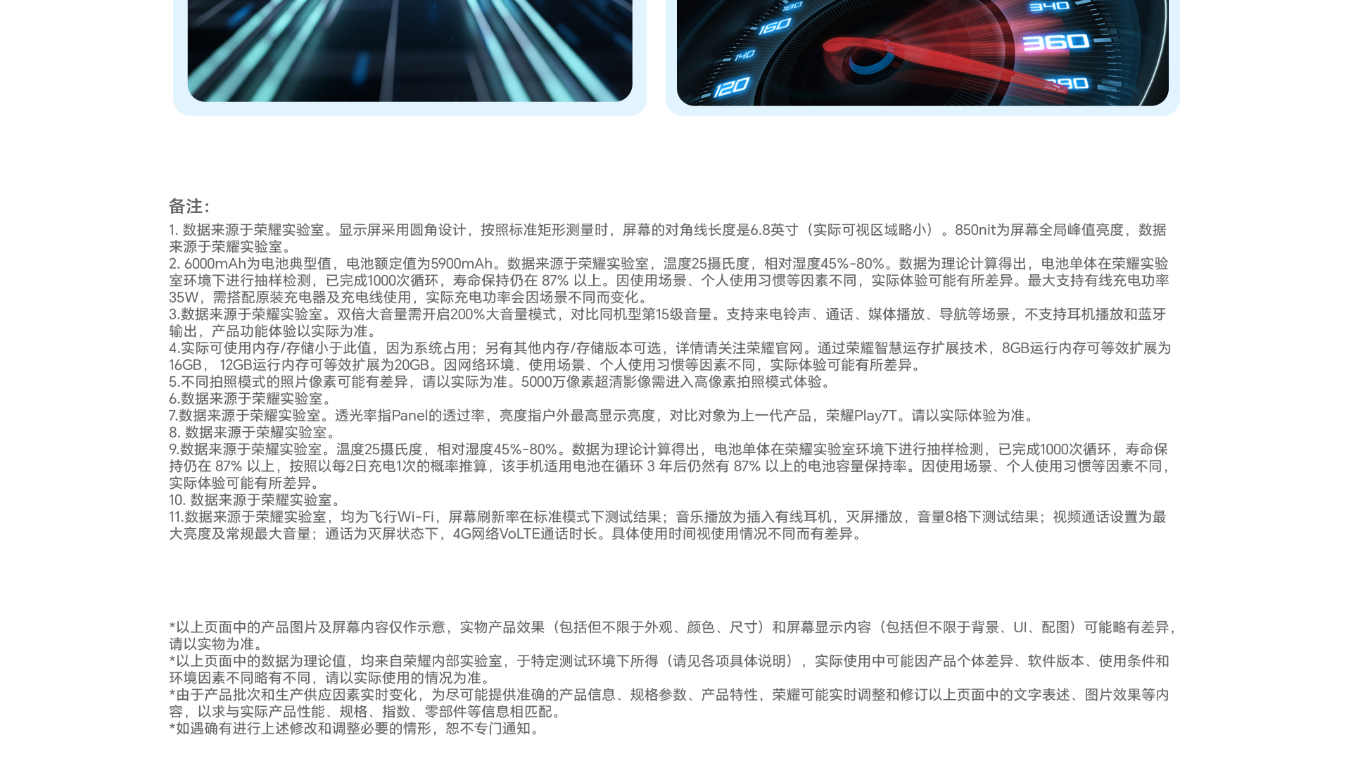 *以上页面中的数据为理论值,均来自荣耀内部实验室,于特定测试环境下所得(请见各项具体说明),实际使用中可能因产品个体差异、软件版本、使用条件和环境因素不同略有不同,请以实际使用的情况为准。