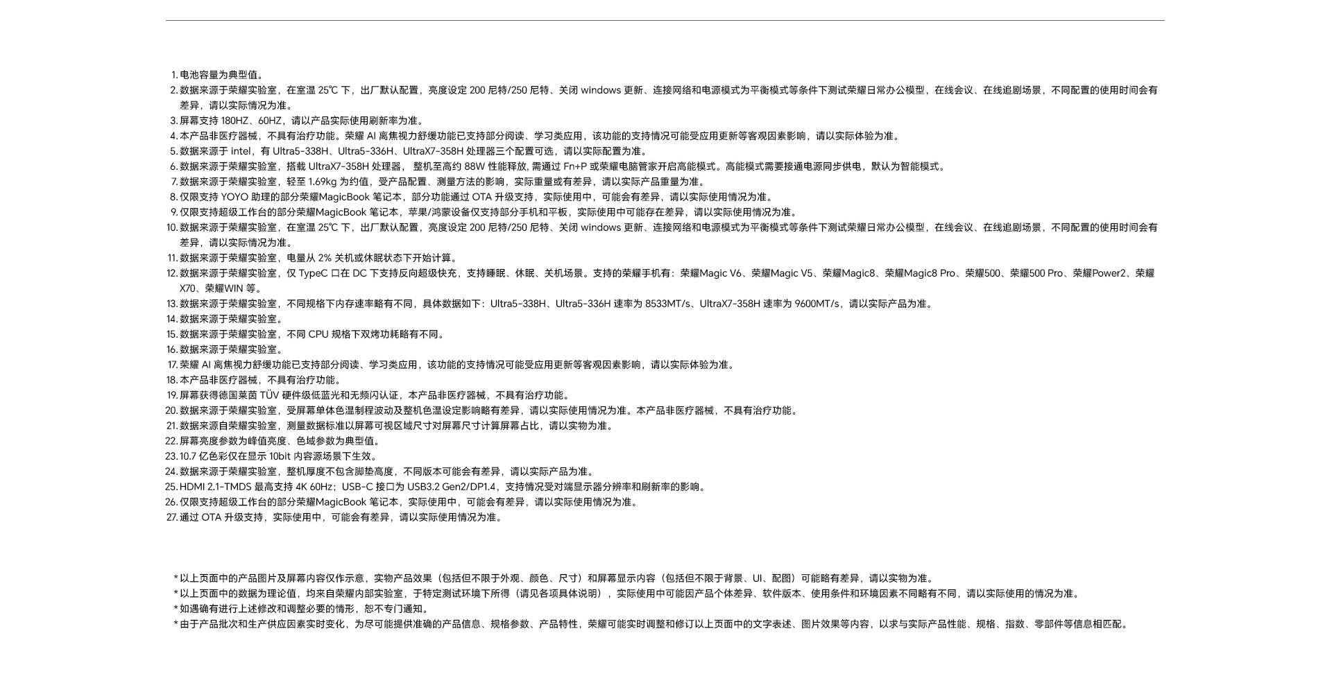 *以上页面中的数据为理论值,均来自荣耀内部实验室,于特定测试环境下所得(请见各项具体说明),实际使用中可能因产品个体差异、软件版本、使用条件和环境因素不同略有不同,请以实际使用的情况为准。