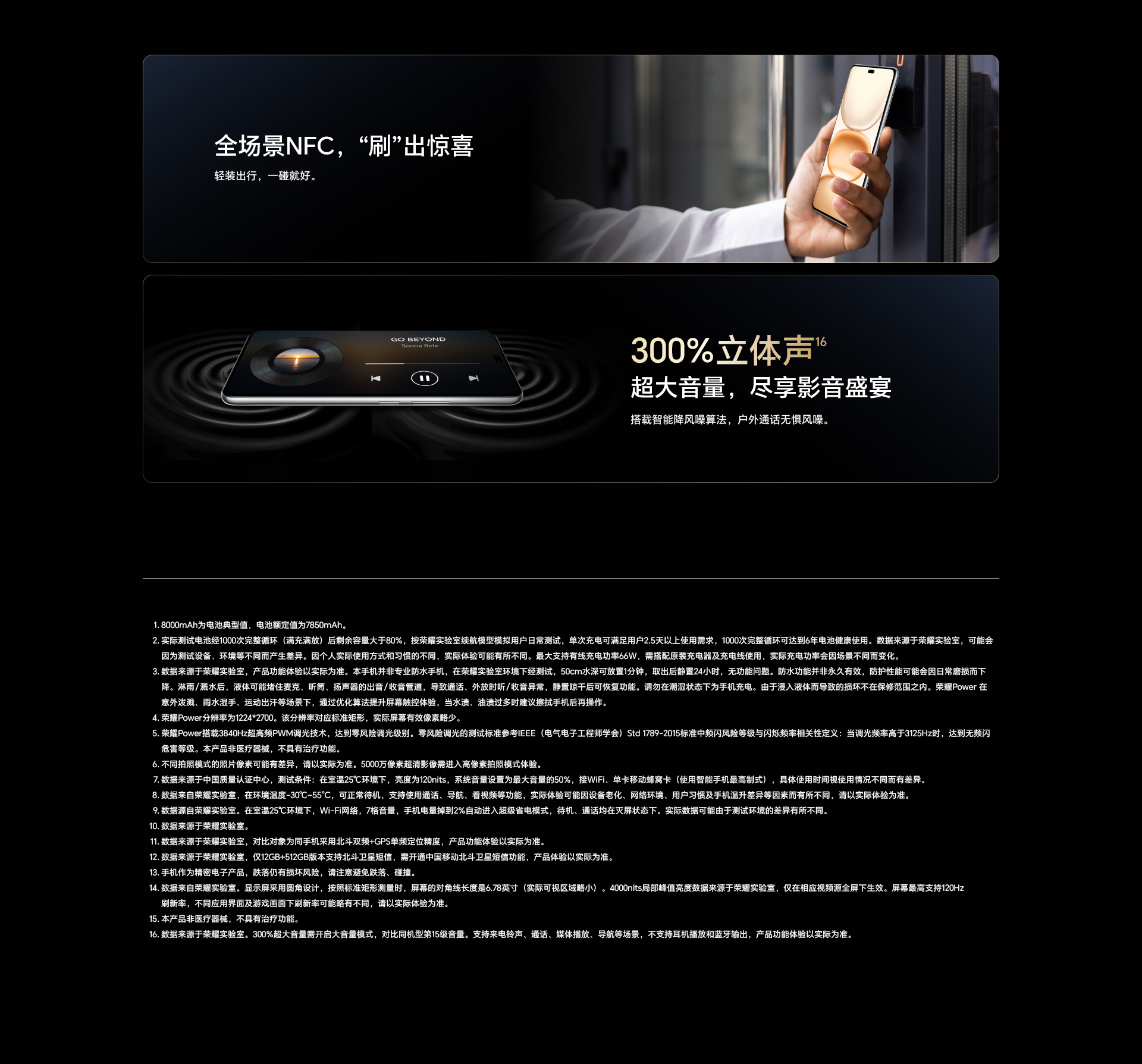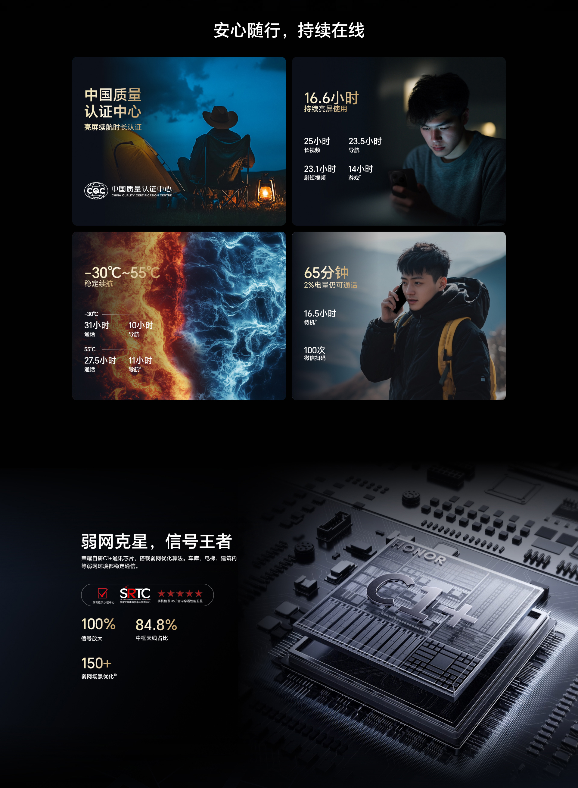 *以上页面中的数据为理论值,均来自荣耀内部实验室,于特定测试环境下所得(请见各项具体说明),实际使用中可能因产品个体差异、软件版本、使用条件和环境因素不同略有不同,请以实际使用的情况为准。