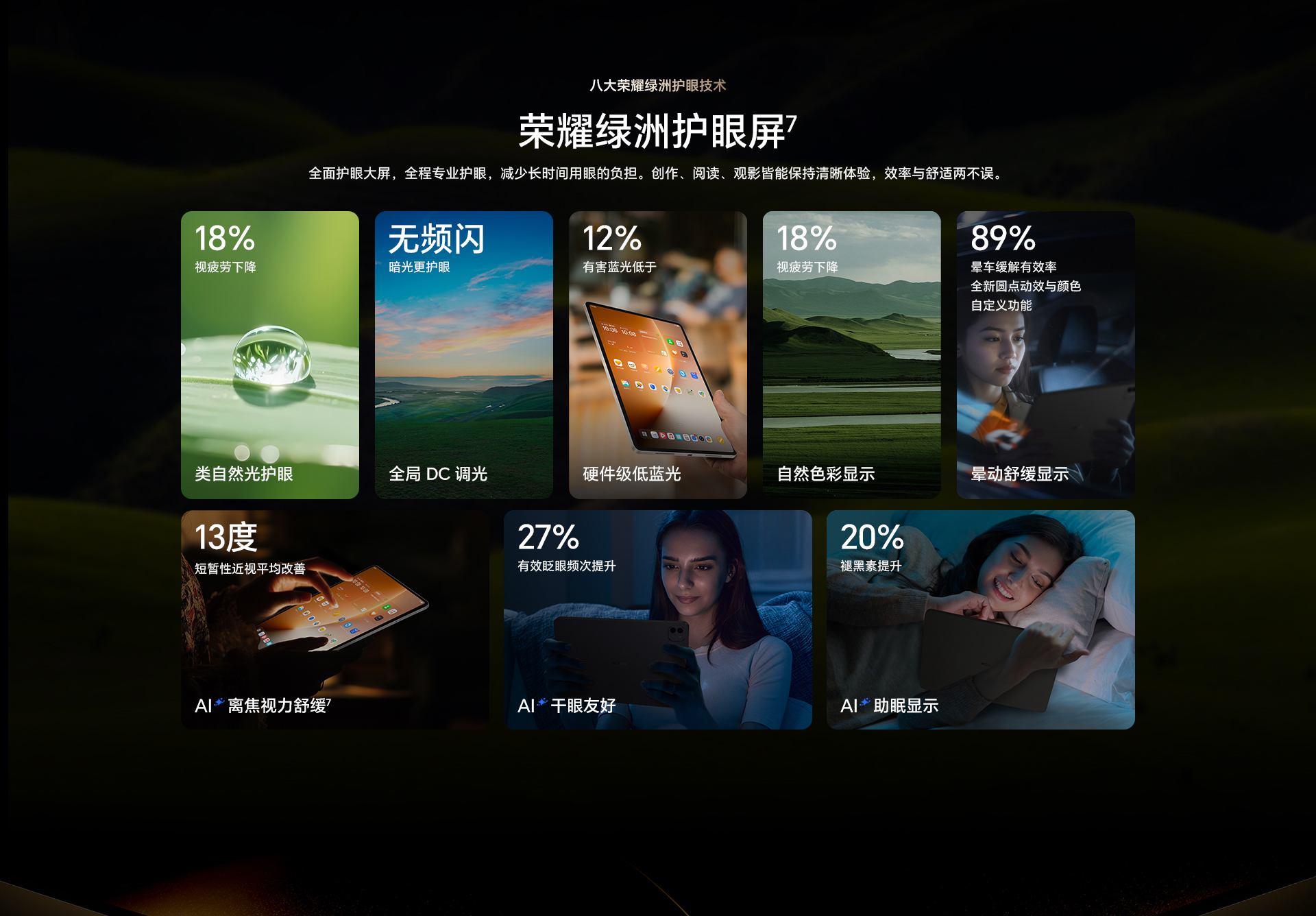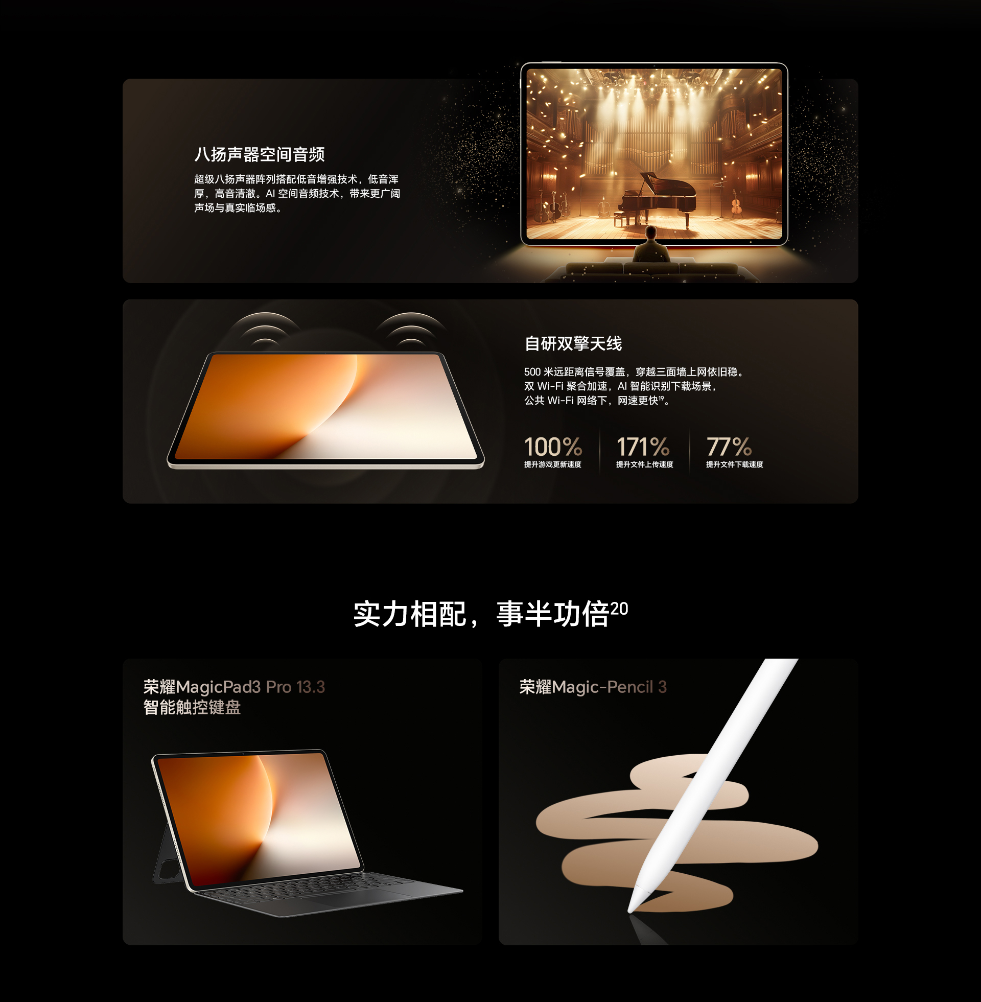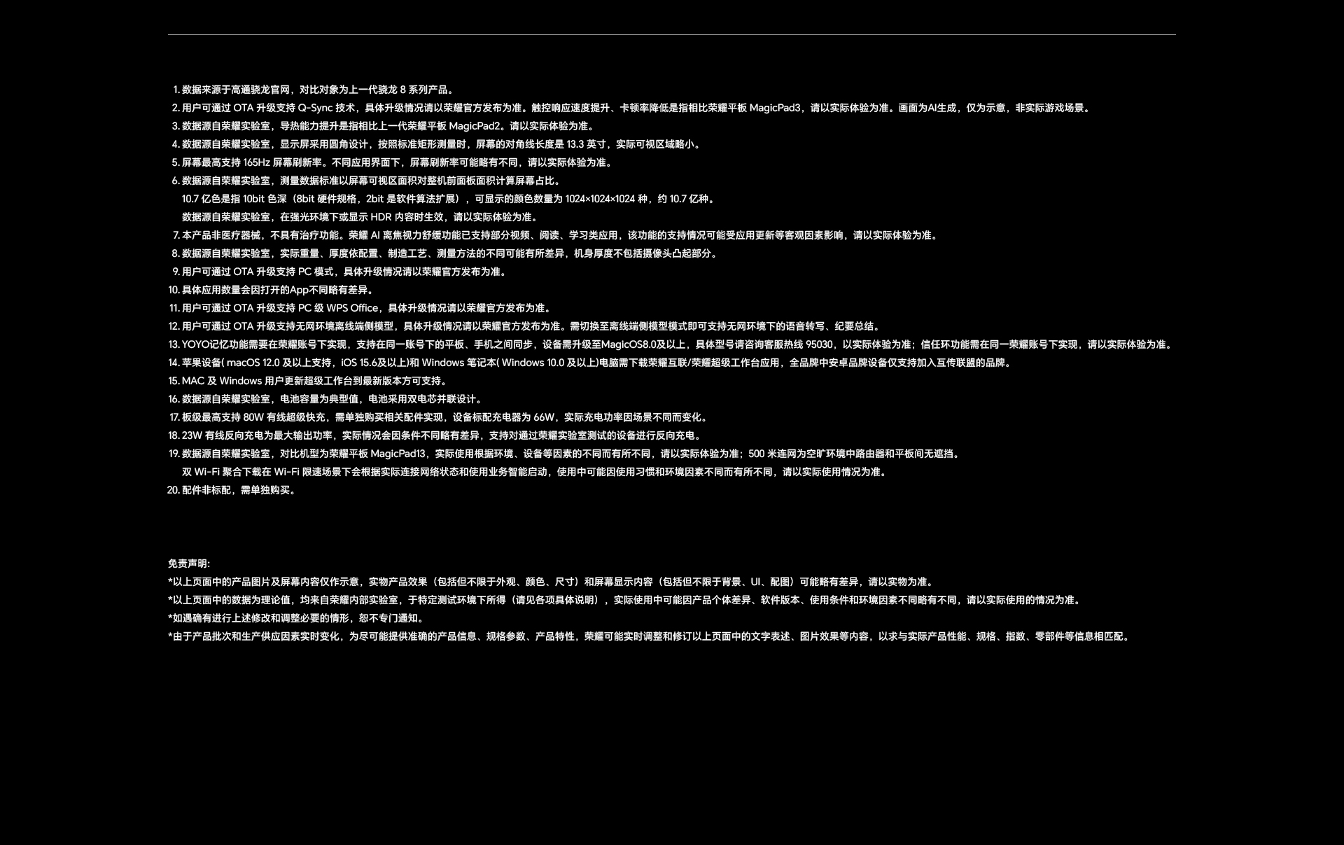 *以上页面中的数据为理论值,均来自荣耀内部实验室,于特定测试环境下所得(请见各项具体说明),实际使用中可能因产品个体差异、软件版本、使用条件和环境因素不同略有不同,请以实际使用的情况为准。