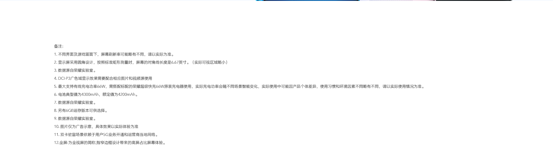 *以上页面中的数据为理论值,均来自荣耀内部实验室,于特定测试环境下所得(请见各项具体说明),实际使用中可能因产品个体差异、软件版本、使用条件和环境因素不同略有不同,请以实际使用的情况为准。
