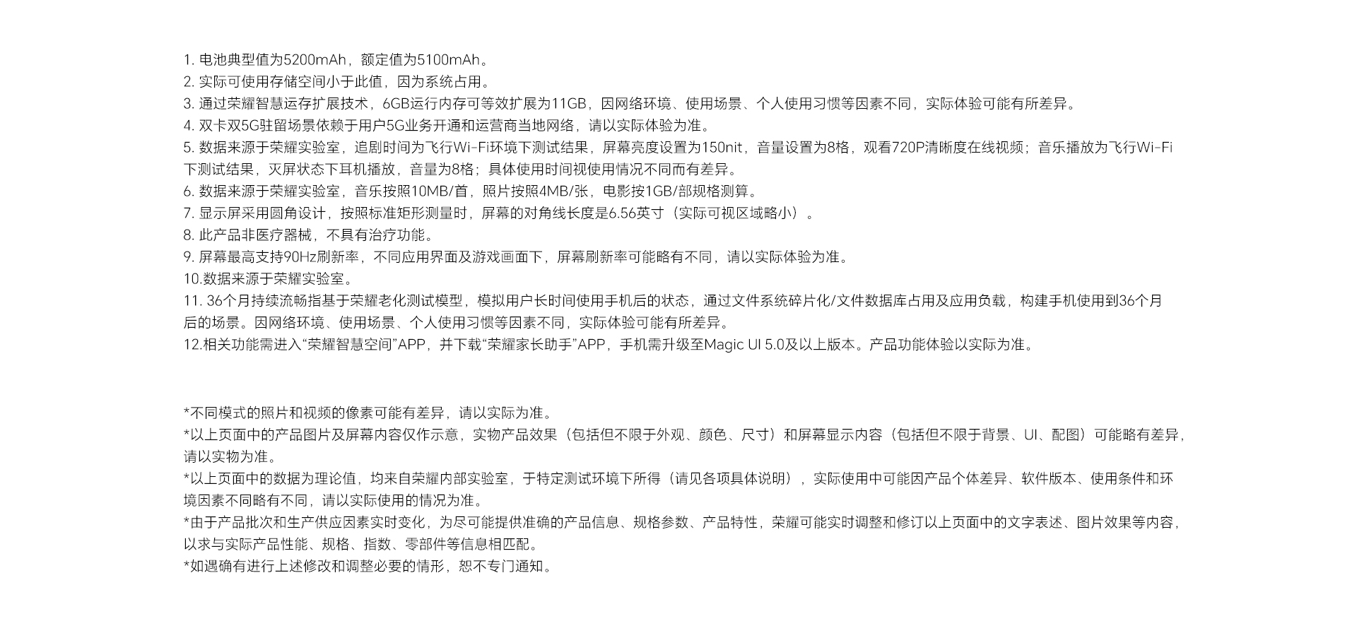 *以上页面中的数据为理论值,均来自荣耀内部实验室,于特定测试环境下所得(请见各项具体说明),实际使用中可能因产品个体差异、软件版本、使用条件和环境因素不同略有不同,请以实际使用的情况为准。