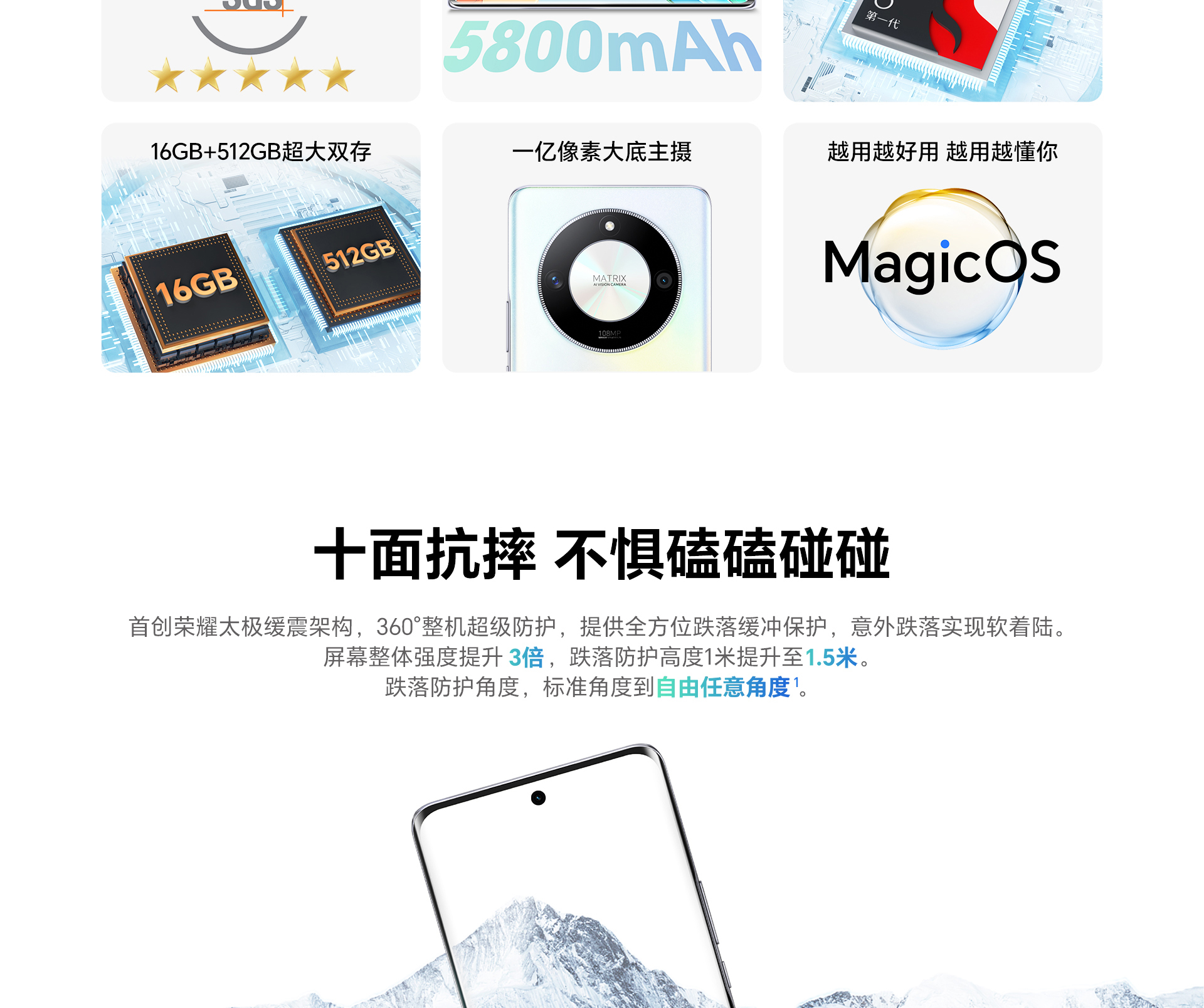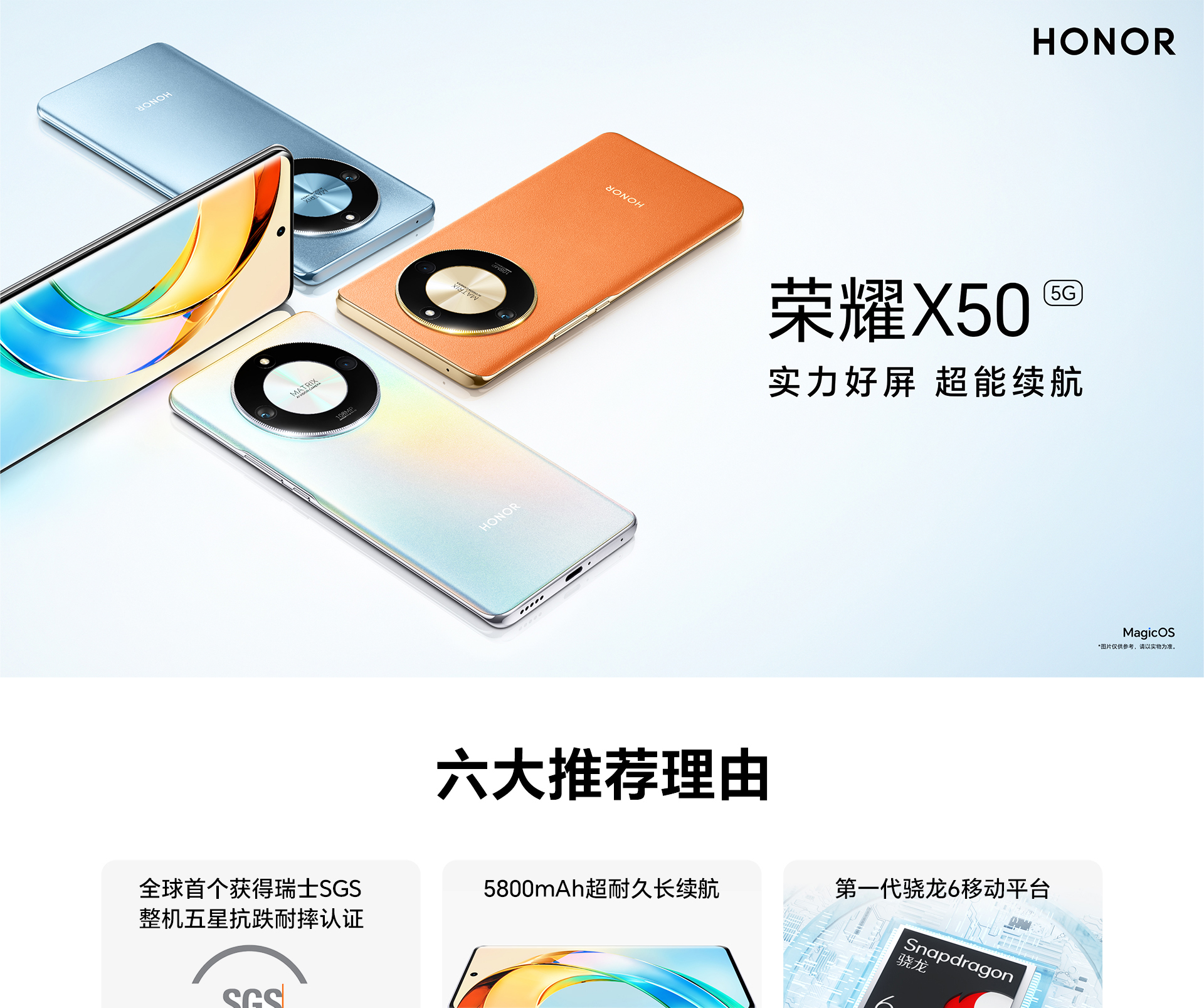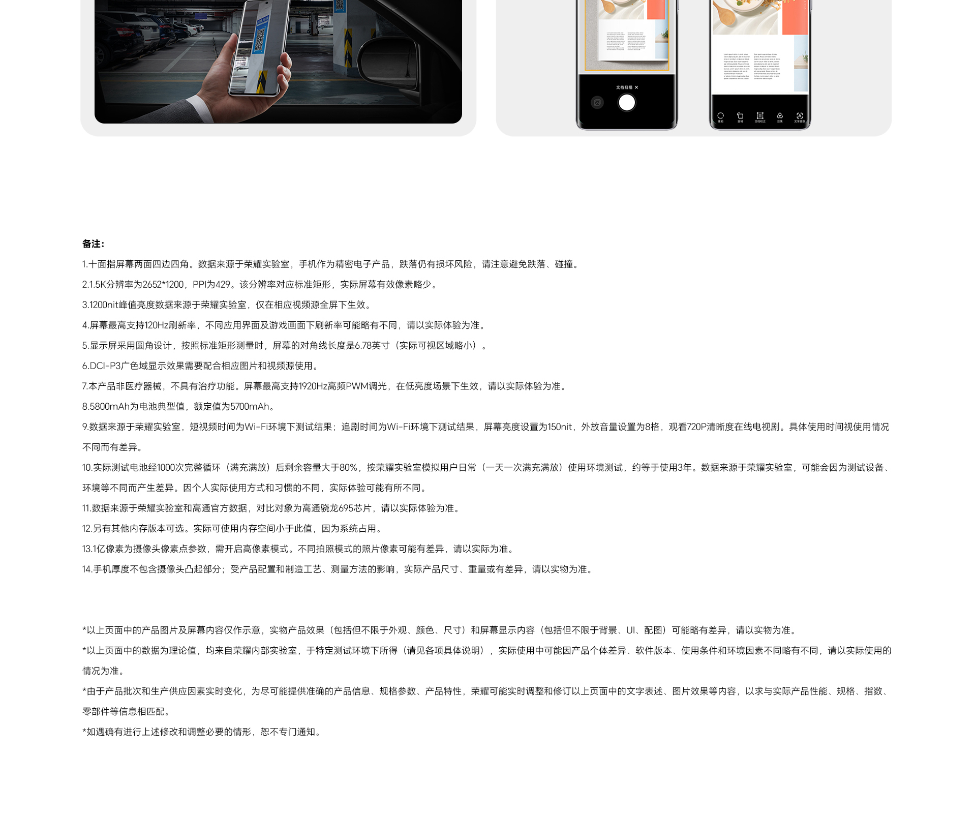 *以上页面中的数据为理论值,均来自荣耀内部实验室,于特定测试环境下所得(请见各项具体说明),实际使用中可能因产品个体差异、软件版本、使用条件和环境因素不同略有不同,请以实际使用的情况为准。