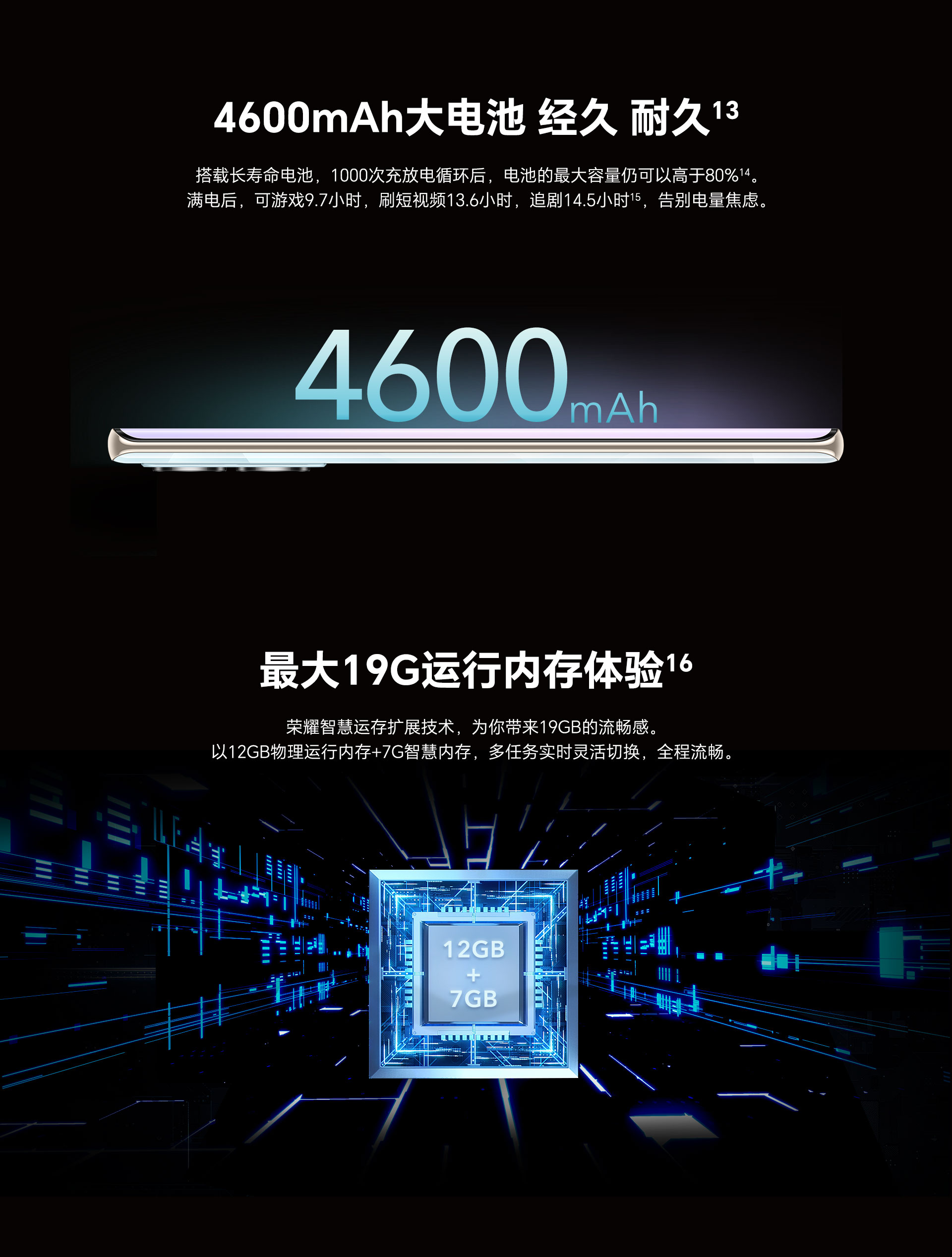 *以上页面中的数据为理论值,均来自荣耀内部实验室,于特定测试环境下所得(请见各项具体说明),实际使用中可能因产品个体差异、软件版本、使用条件和环境因素不同略有不同,请以实际使用的情况为准。