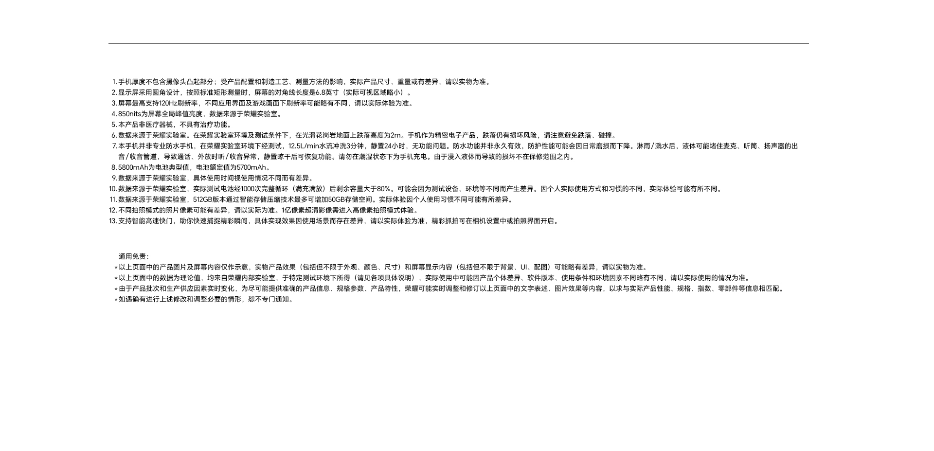 *以上页面中的数据为理论值,均来自荣耀内部实验室,于特定测试环境下所得(请见各项具体说明),实际使用中可能因产品个体差异、软件版本、使用条件和环境因素不同略有不同,请以实际使用的情况为准。