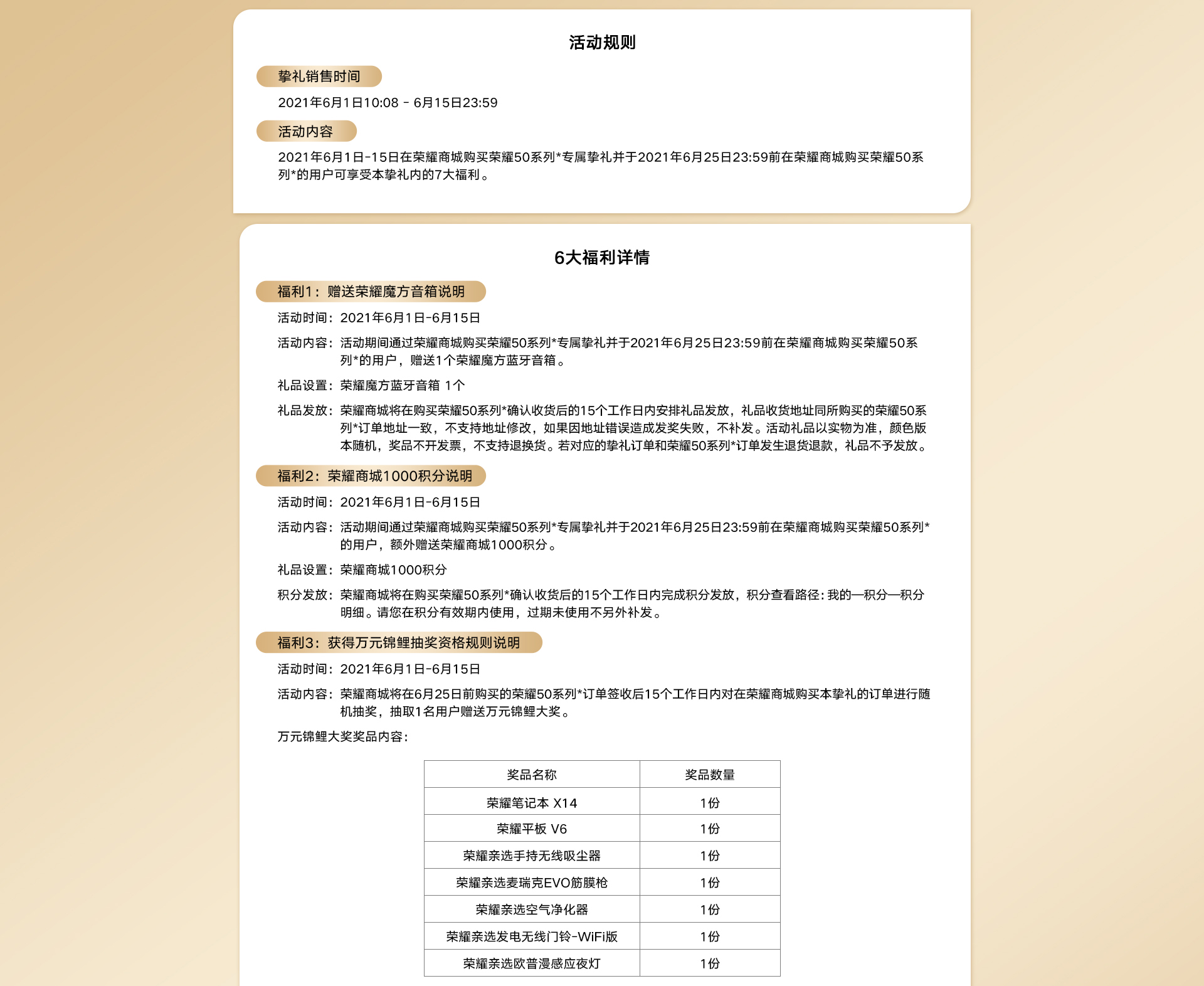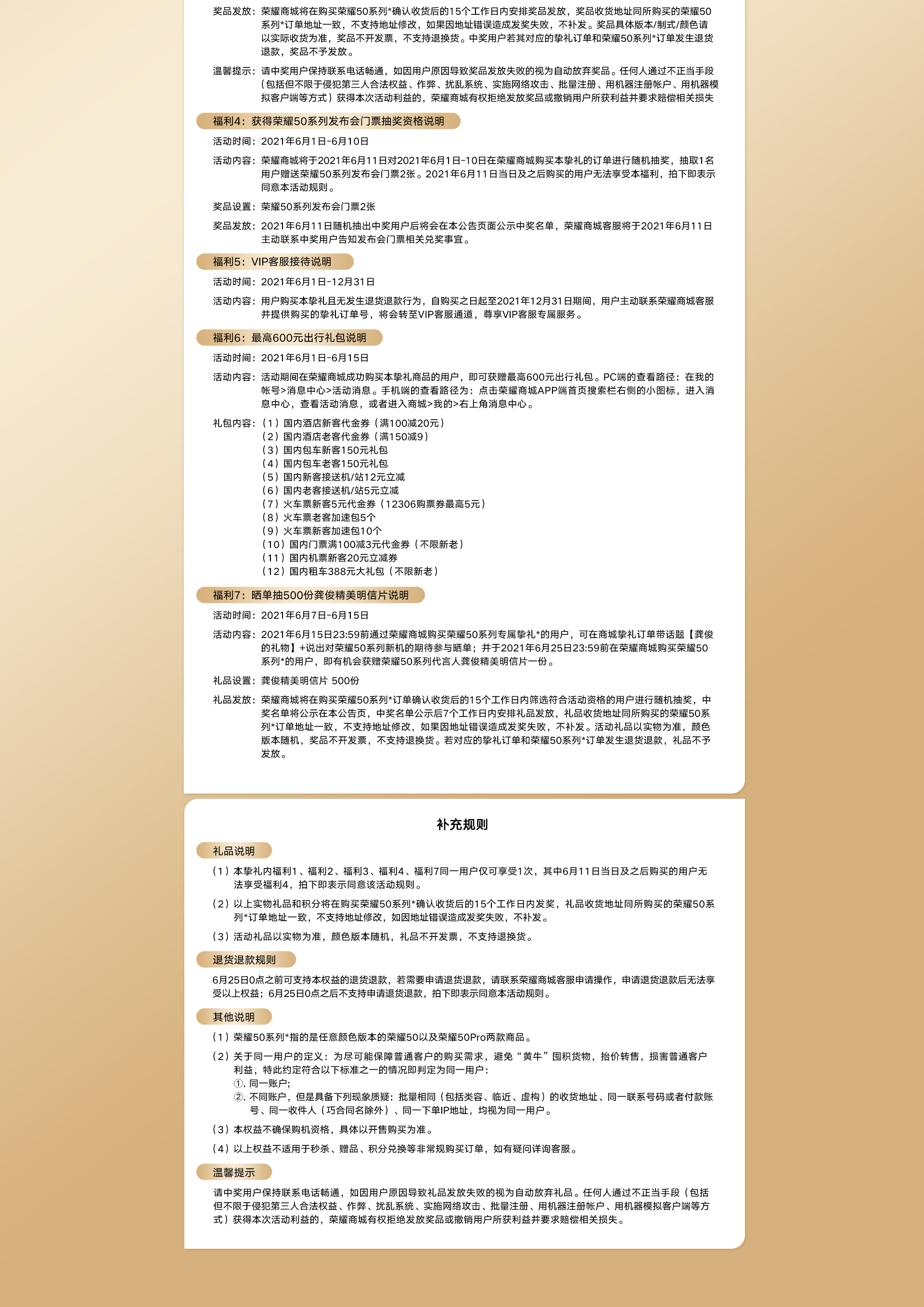 尊敬的用户,您好!6月25日0点之前可支持本权益的退货退款,若需要申请退货退款,请联系荣耀商城客服申请操作,申请退货退款后无法享受以上权益;6月25日0点之后不支持申请退货退款,拍下即表示同意本活动规则,祝您生活愉快!