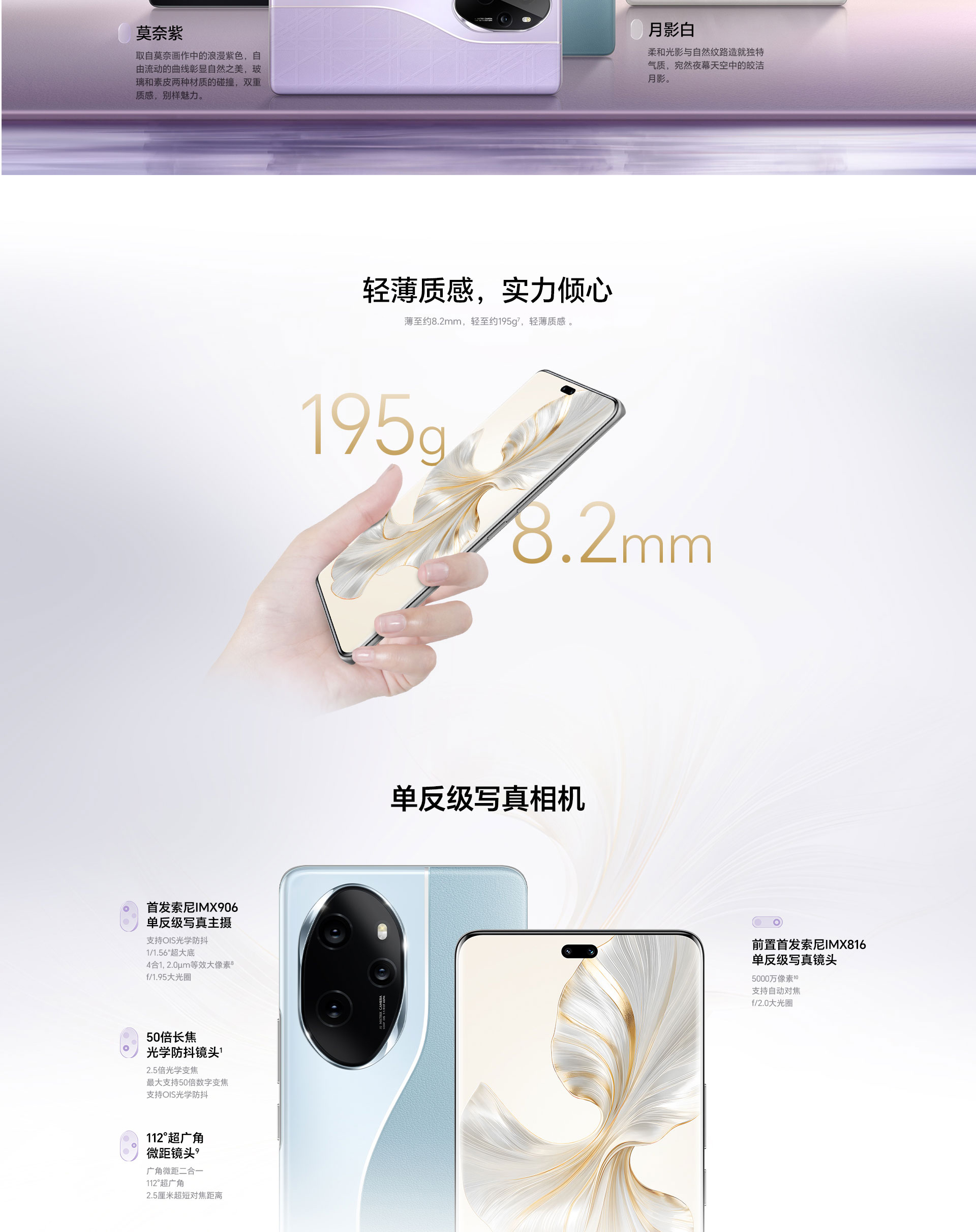 后置三摄: 索尼IMX906单反级写真主摄(5000万像素,f/1.95光圈,支持OIS光学防抖)+112°超广角微距镜头(1200万像素,f/2.2光圈) +50倍长焦光学防抖镜头(3200万像素,f/2.4光圈,支持OIS光学防抖)