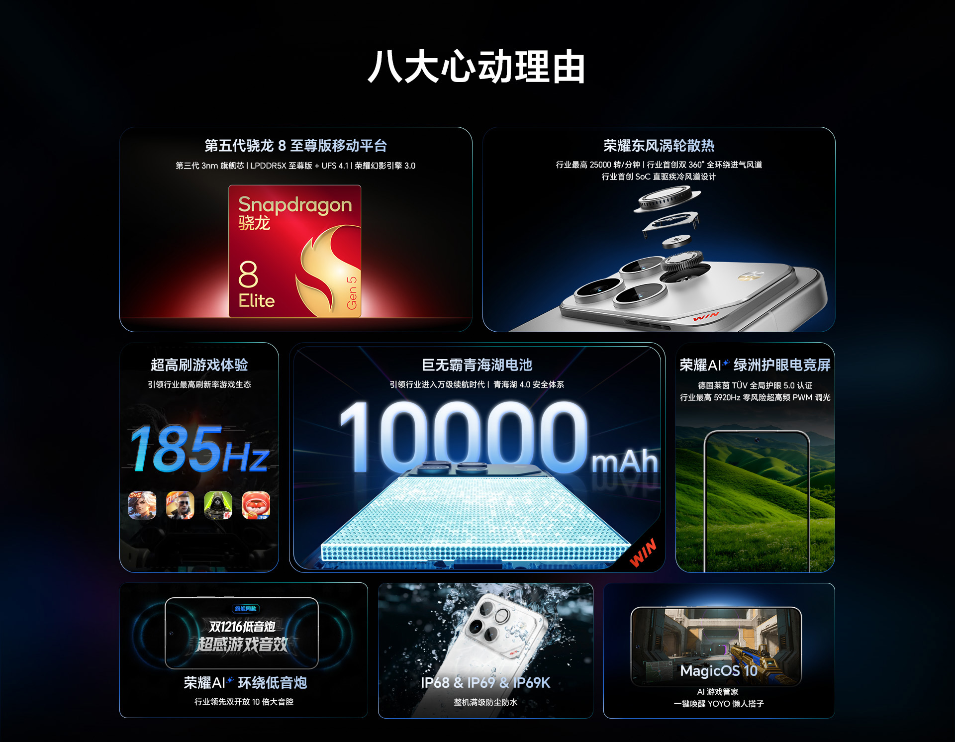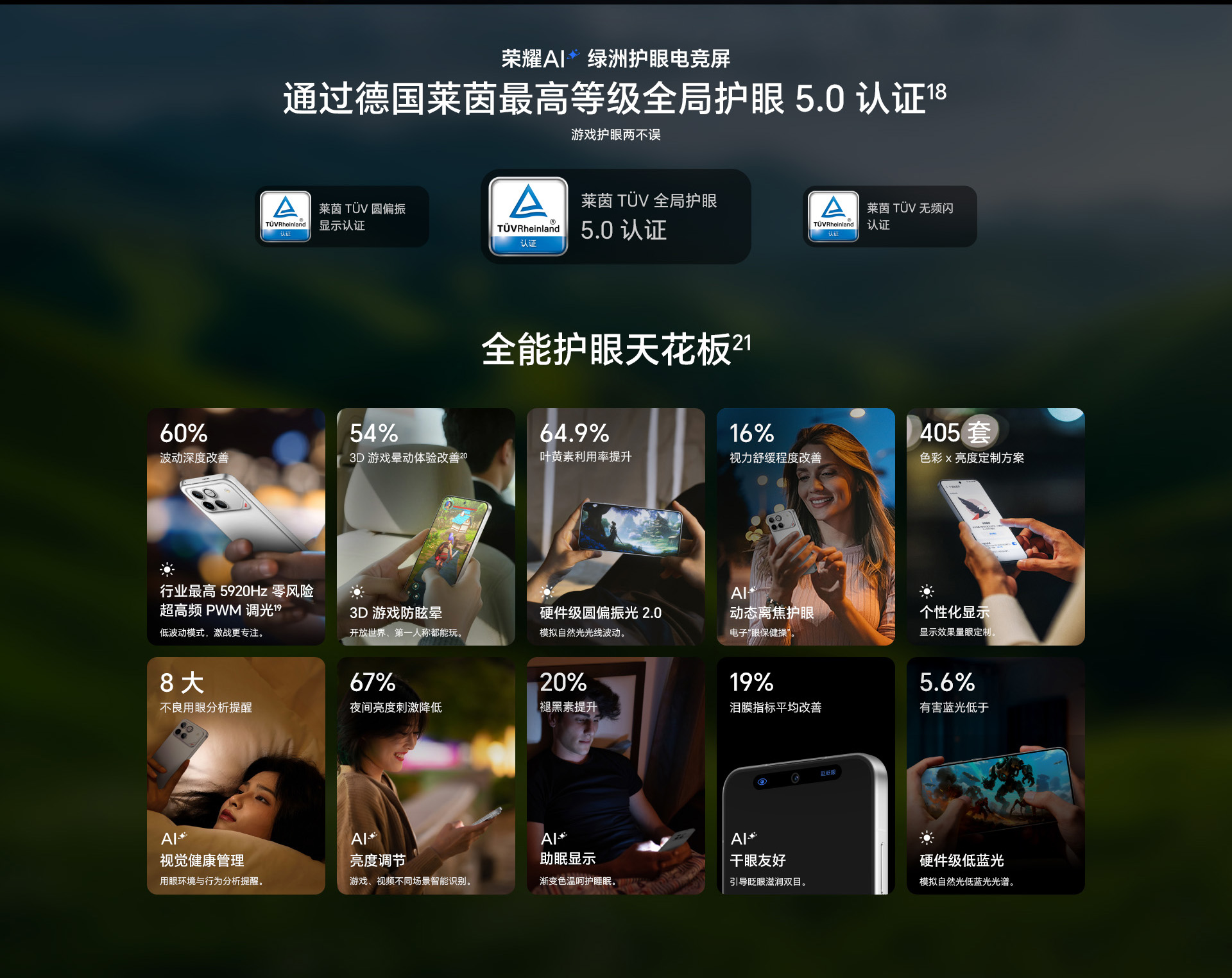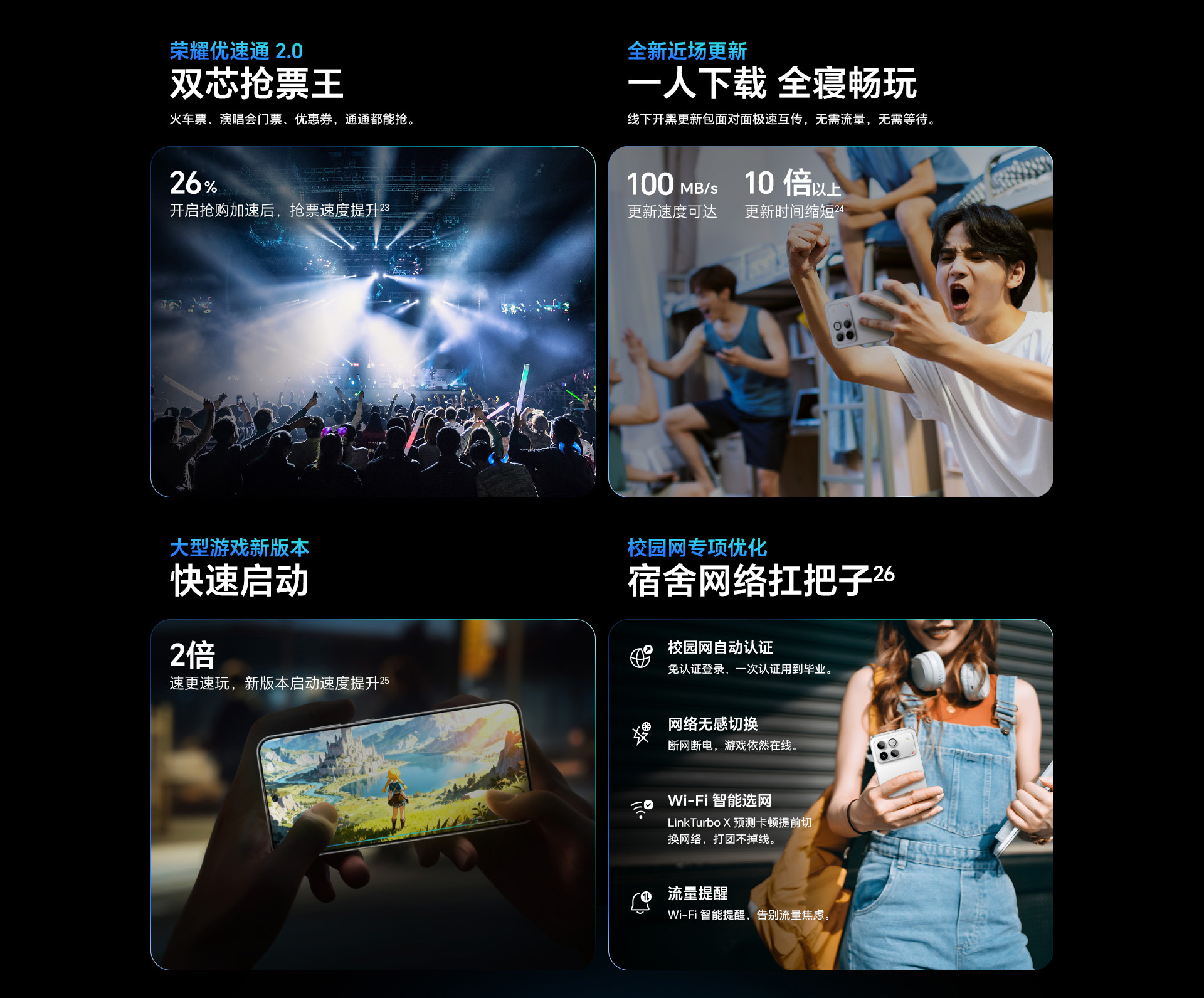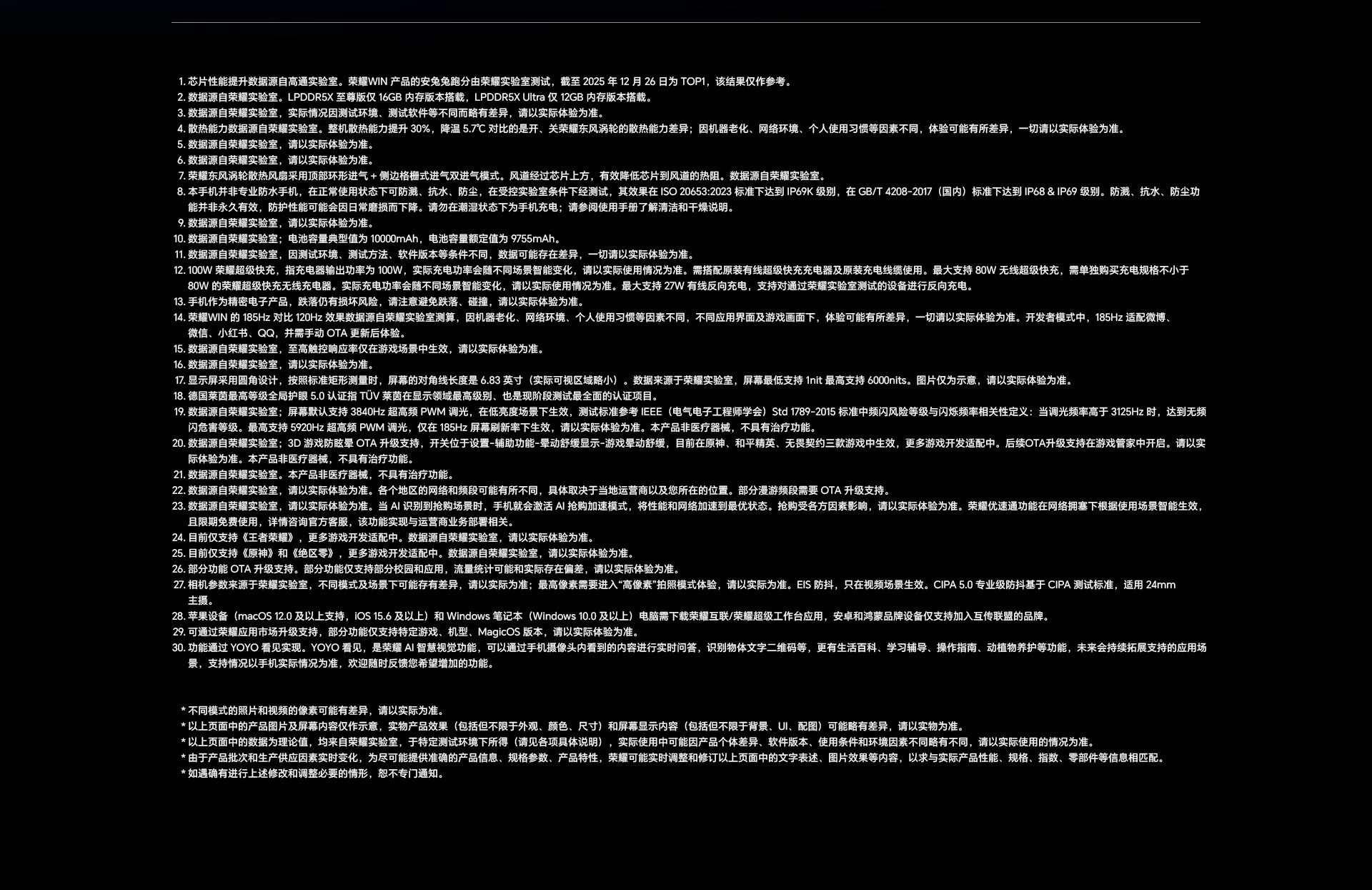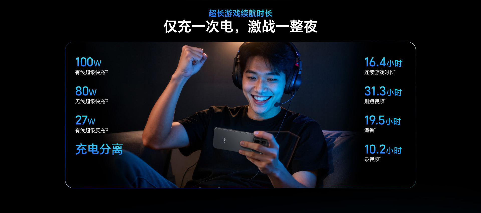 *以上页面中的数据为理论值,均来自荣耀内部实验室,于特定测试环境下所得(请见各项具体说明),实际使用中可能因产品个体差异、软件版本、使用条件和环境因素不同略有不同,请以实际使用的情况为准。