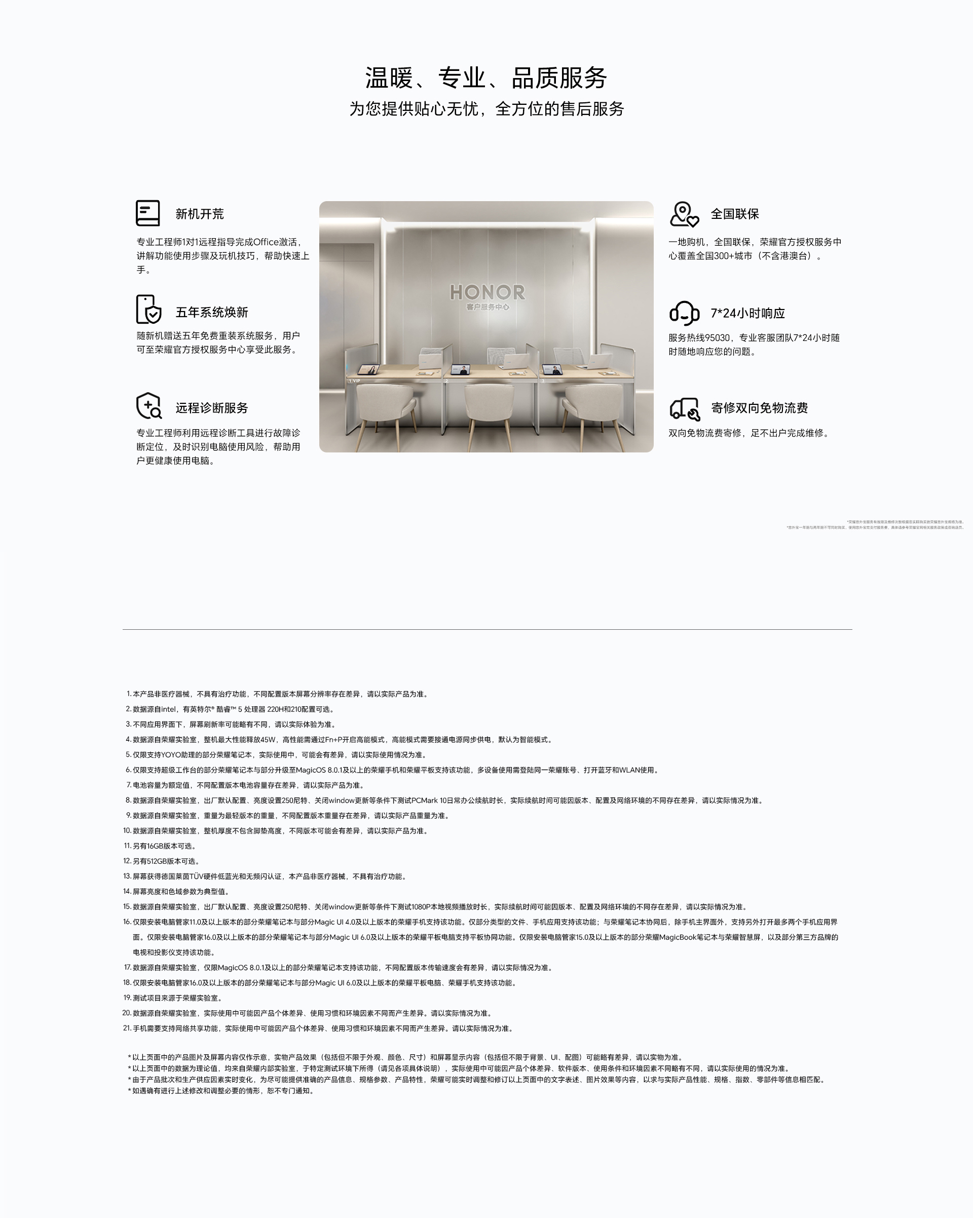 *为提供尽可能准确的产品信息、规格参数、产品特性,荣耀可能实时调整和修订以上页面中的文字表述、图片效果等内容,以求与实际产品性能、规格、指数、零部件等信息相匹配,由于产品批次和生产供应因素实时变化,如遇确有进行上述修改和调整必要的情形,恕不专门通知。
