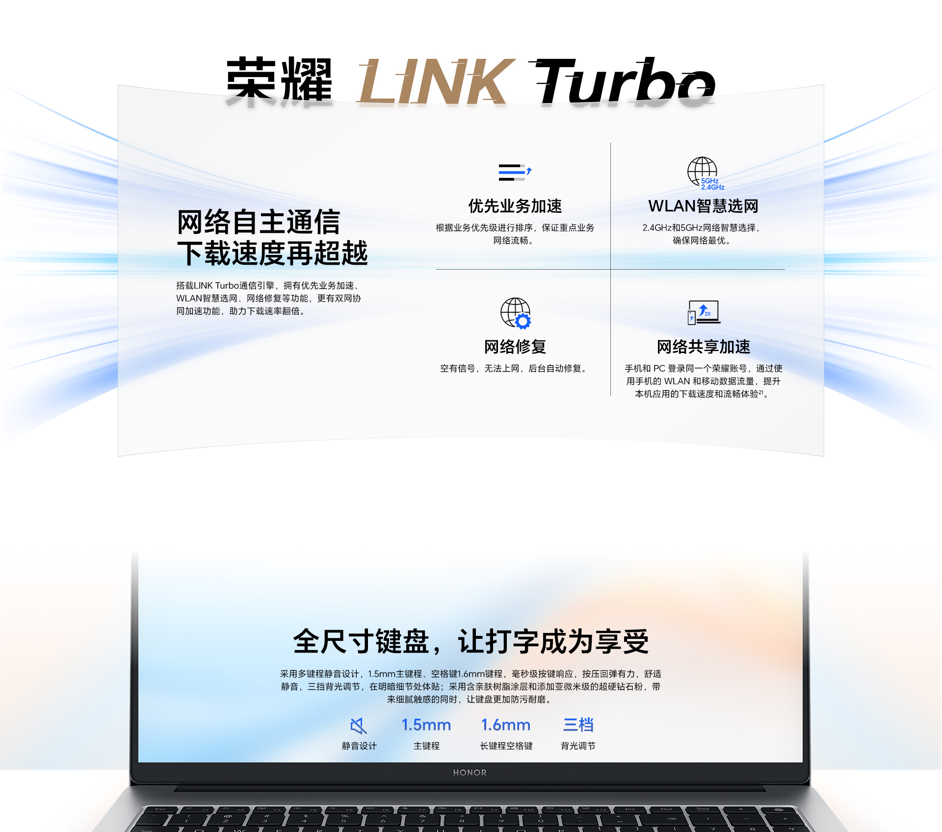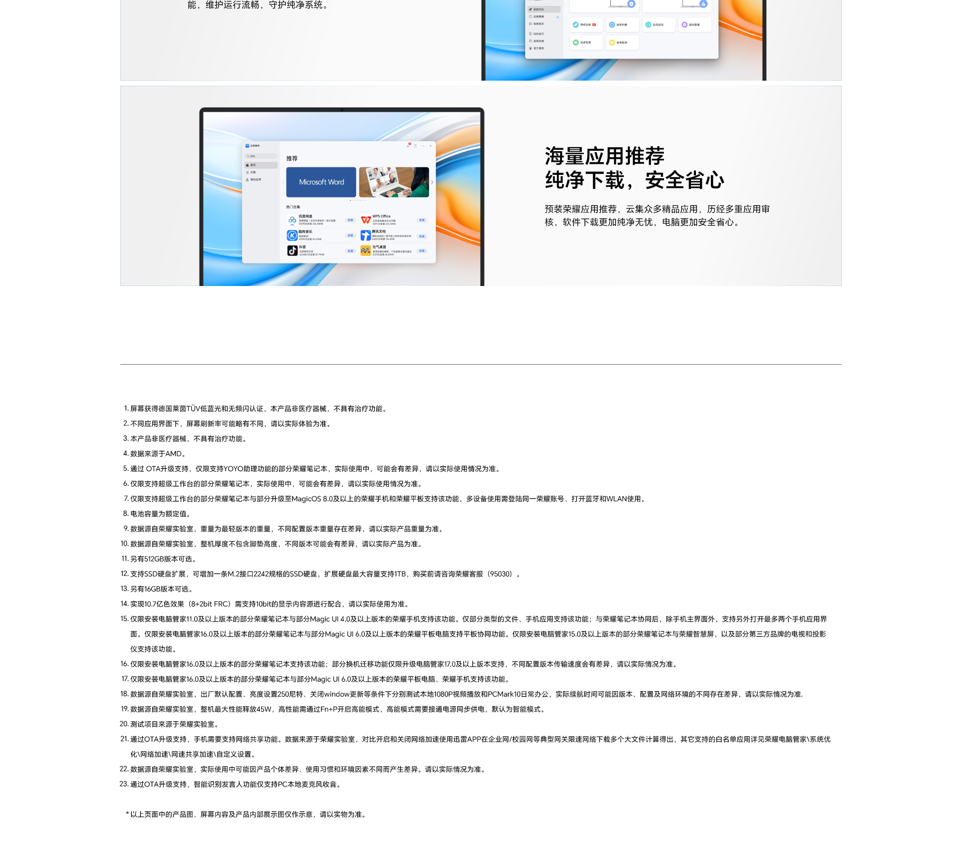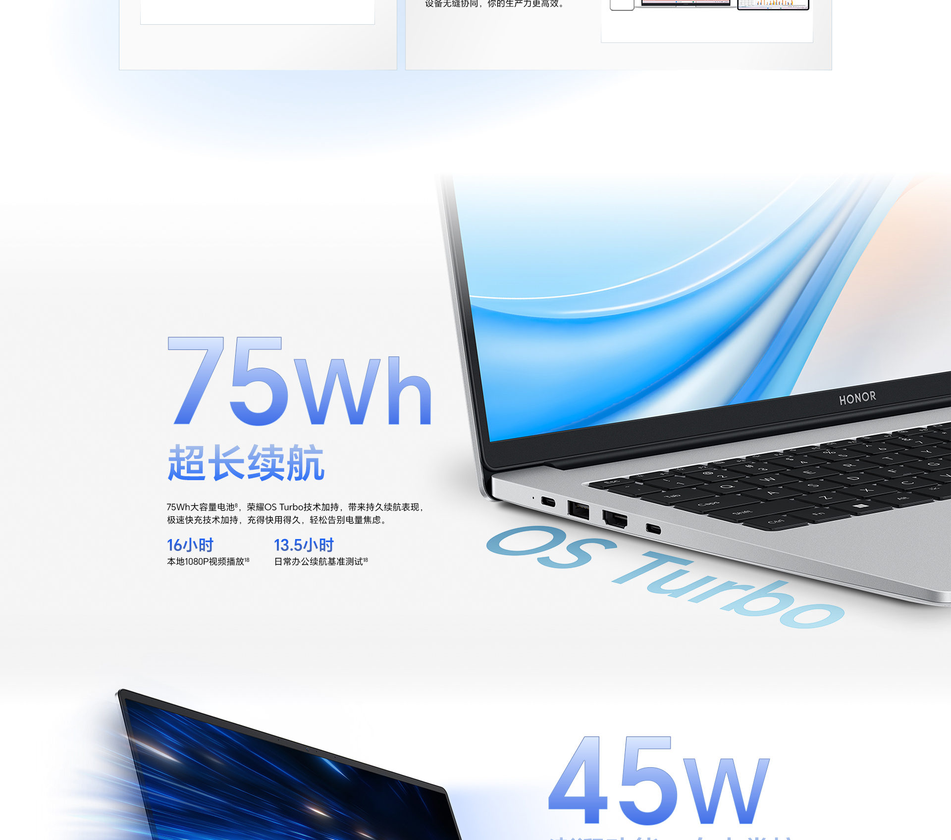 *以上页面中的数据为理论值,均来自荣耀内部实验室,于特定测试环境下所得(请见各项具体说明),实际使用中可能因产品个体差异、软件版本、使用条件和环境因素不同略有不同,请以实际使用的情况为准。