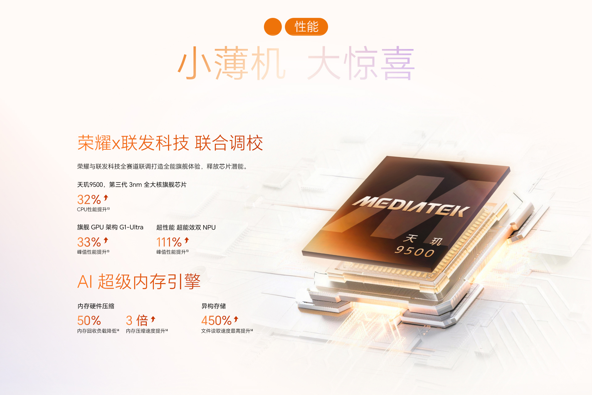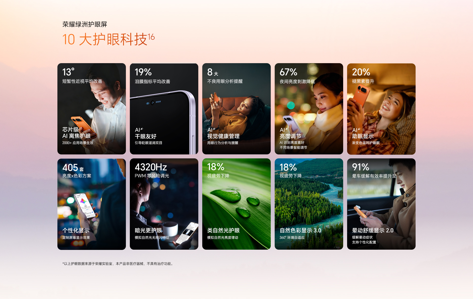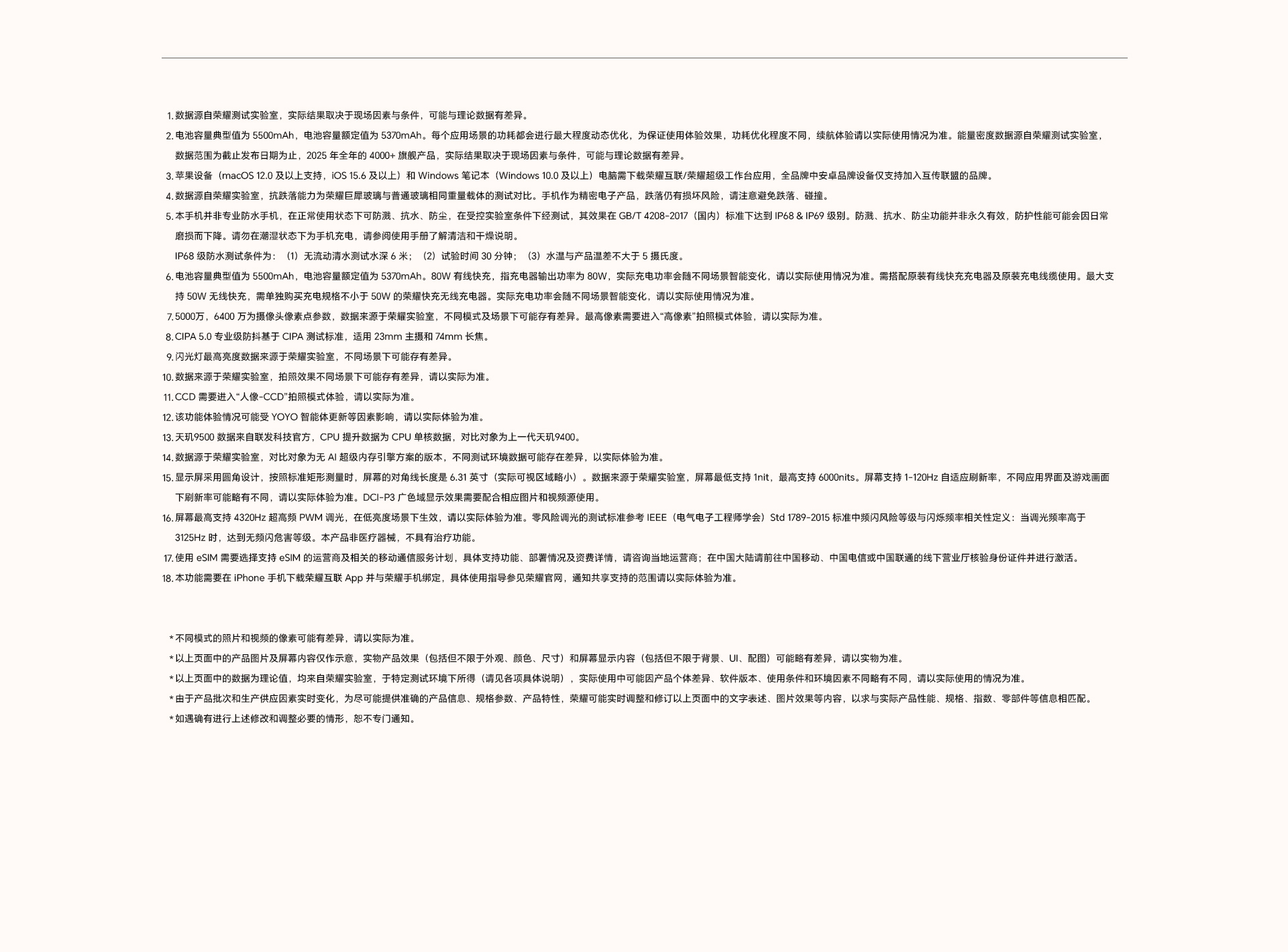 *以上页面中的数据为理论值,均来自荣耀内部实验室,于特定测试环境下所得(请见各项具体说明),实际使用中可能因产品个体差异、软件版本、使用条件和环境因素不同略有不同,请以实际使用的情况为准。