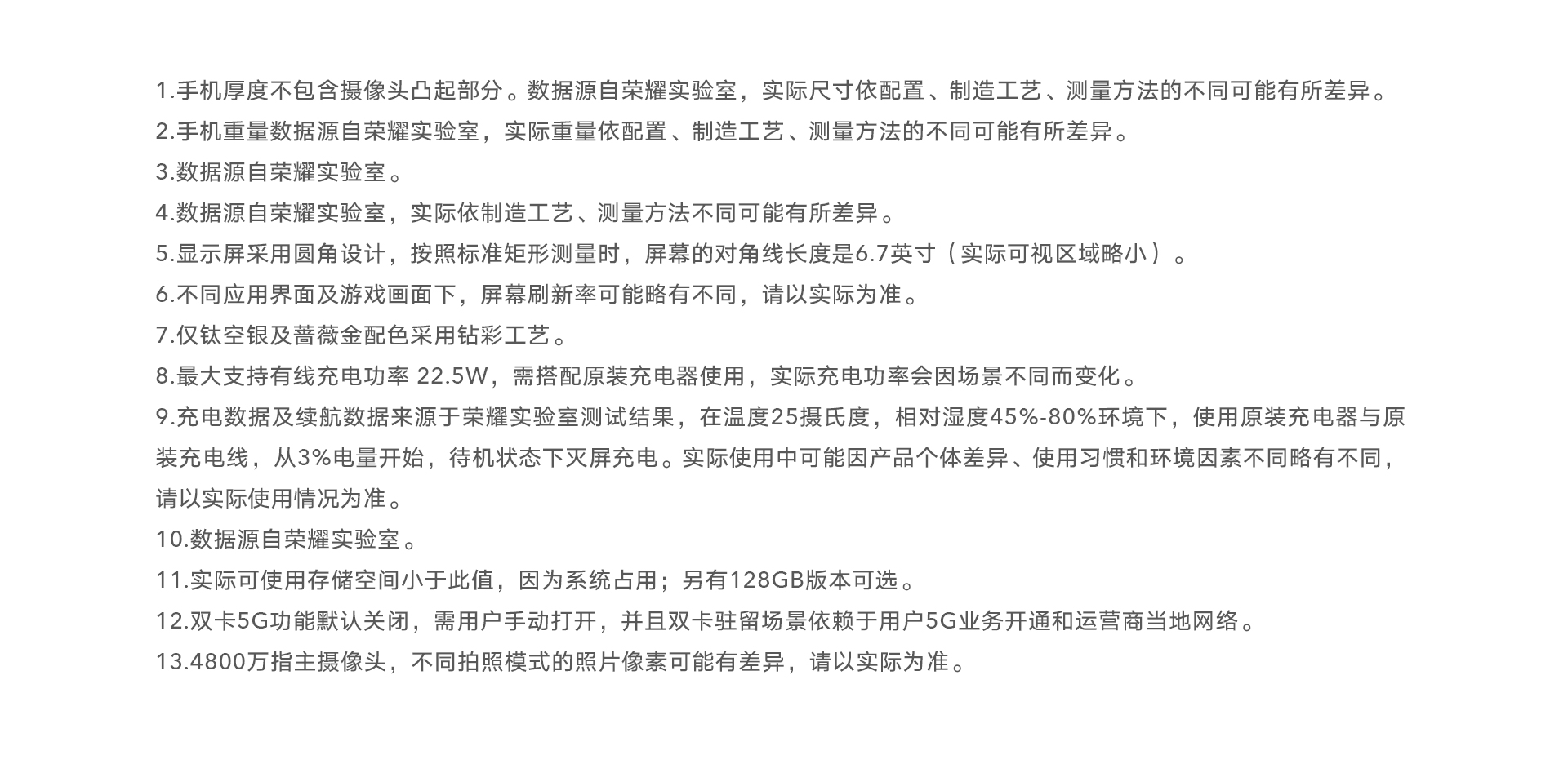 *以上页面中的数据为理论值,均来自荣耀内部实验室,于特定测试环境下所得(请见各项具体说明),实际使用中可能因产品个体差异、软件版本、使用条件和环境因素不同略有不同,请以实际使用的情况为准。