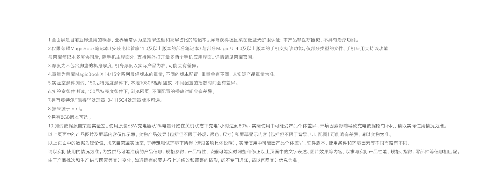 *为提供尽可能准确的产品信息、规格参数、产品特性,荣耀可能实时调整和修订以上页面中的文字表述、图片效果等内容,以求与实际产品性能、规格、指数、零部件等信息相匹配,由于产品批次和生产供应因素实时变化,如遇确有进行上述修改和调整必要的情形,恕不专门通知。