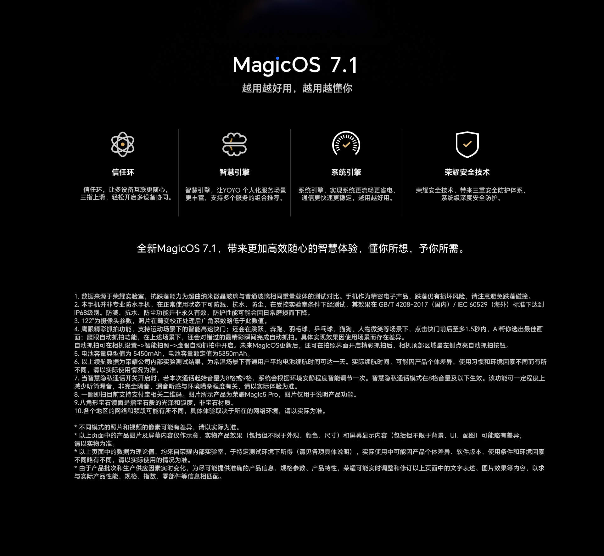 *为提供尽可能准确的产品信息、规格参数、产品特性,荣耀可能实时调整和修订以上页面中的文字表述、图片效果等内容,以求与实际产品性能、规格、指数、零部件等信息相匹配,由于产品批次和生产供应因素实时变化,如遇确有进行上述修改和调整必要的情形,恕不专门通知。