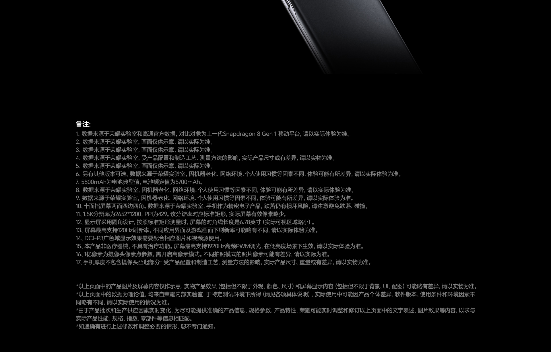 *以上页面中的数据为理论值,均来自荣耀内部实验室,于特定测试环境下所得(请见各项具体说明),实际使用中可能因产品个体差异、软件版本、使用条件和环境因素不同略有不同,请以实际使用的情况为准。