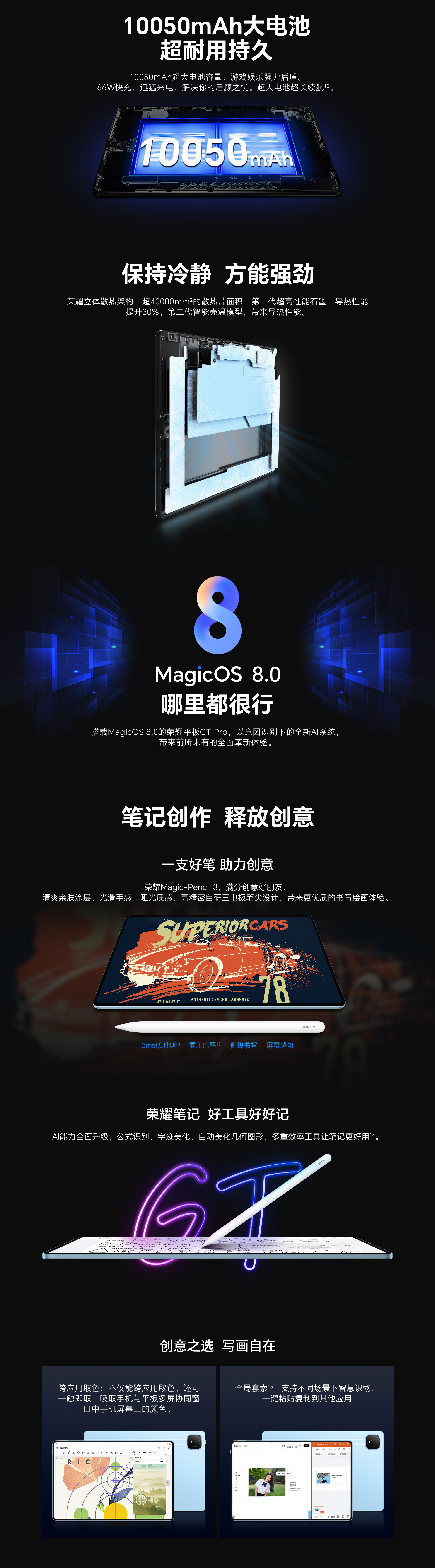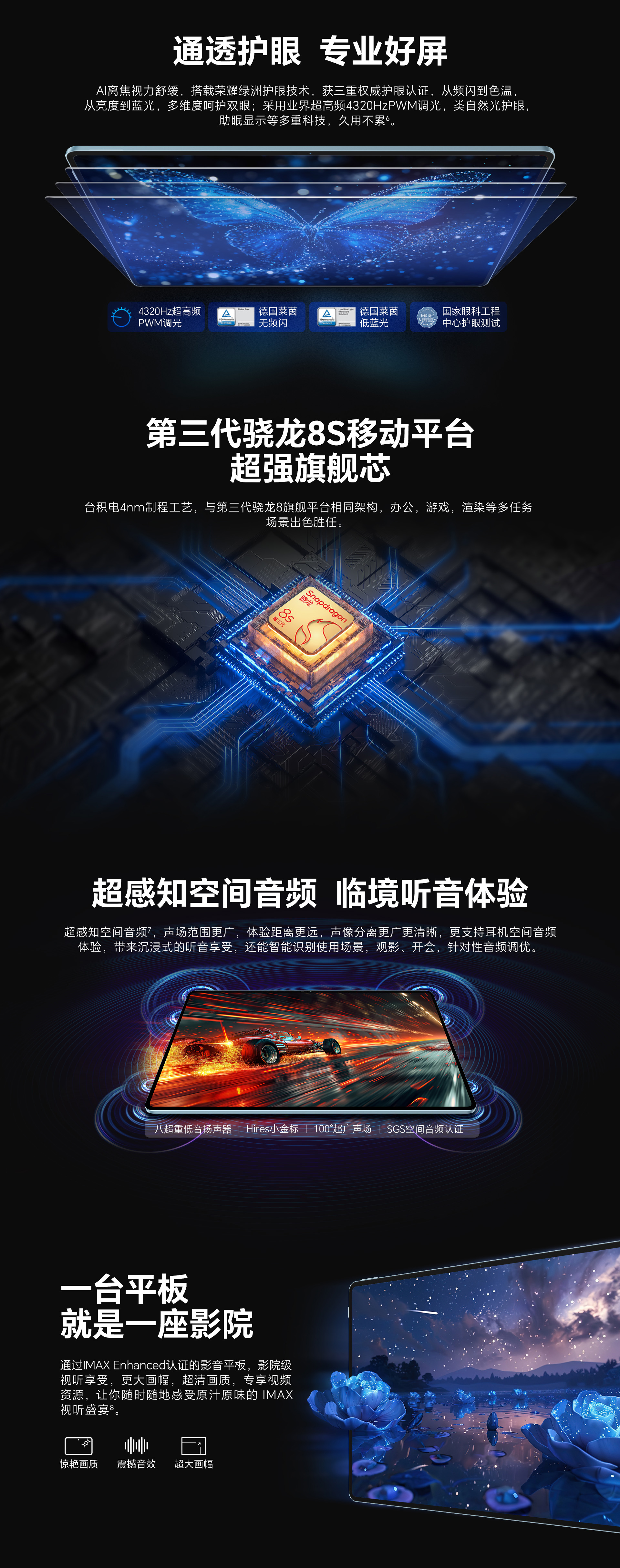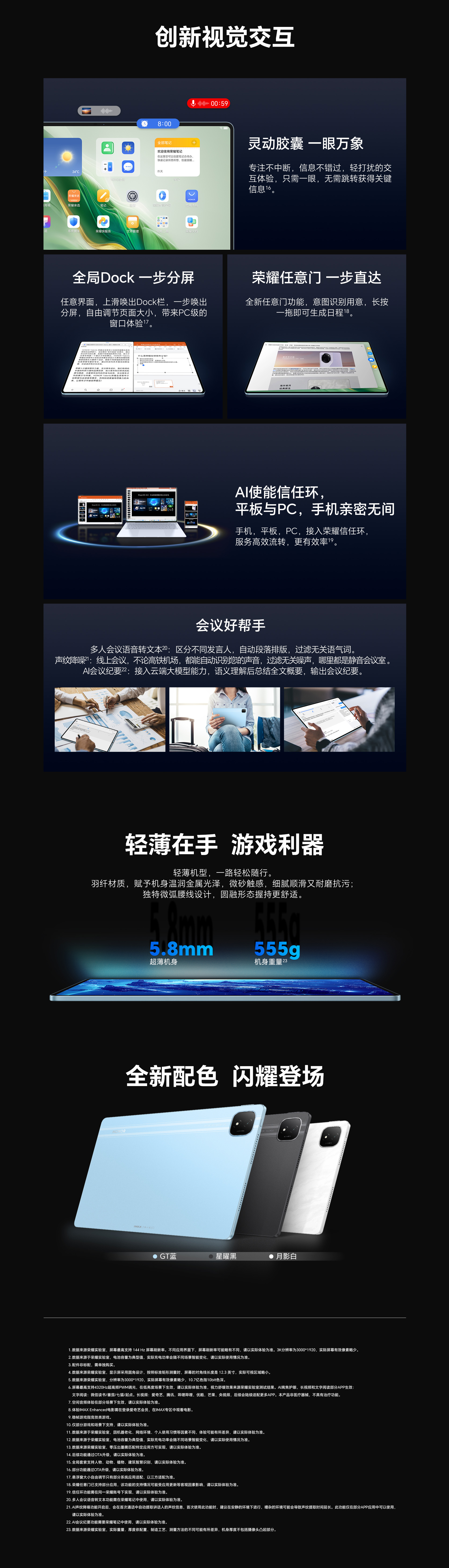 *以上页面中的数据为理论值,均来自荣耀内部实验室,于特定测试环境下所得(请见各项具体说明),实际使用中可能因产品个体差异、软件版本、使用条件和环境因素不同略有不同,请以实际使用的情况为准。