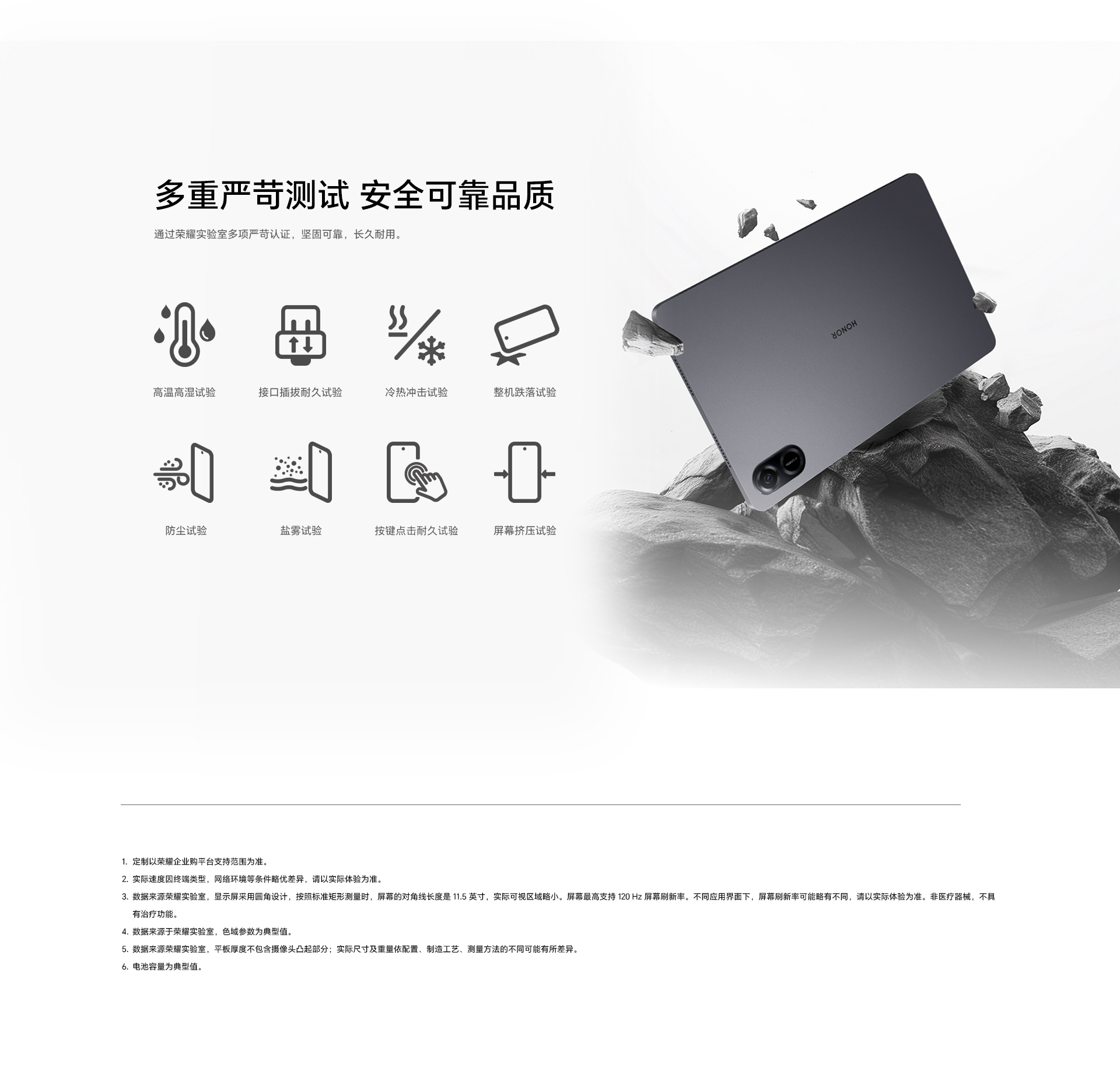 *以上页面中的数据为理论值,均来自荣耀内部实验室,于特定测试环境下所得(请见各项具体说明),实际使用中可能因产品个体差异、软件版本、使用条件和环境因素不同略有不同,请以实际使用的情况为准。