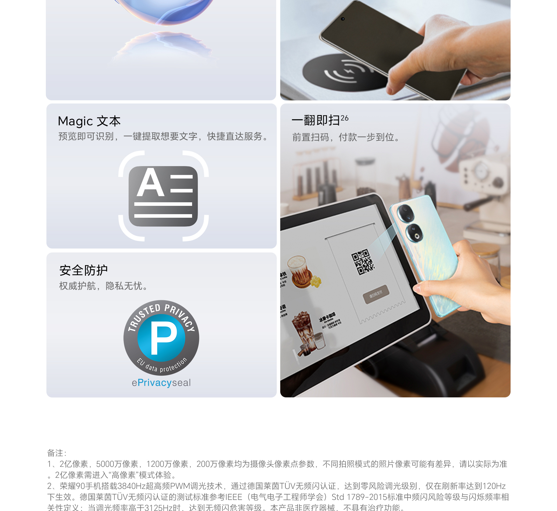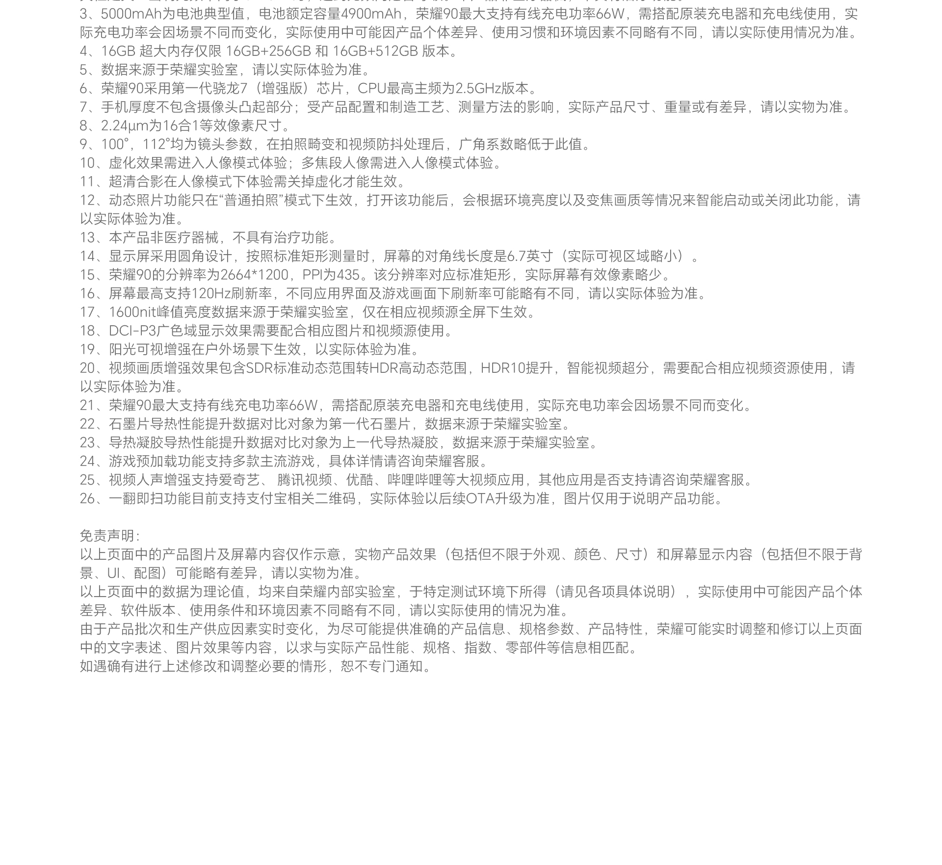*以上页面中的数据为理论值,均来自荣耀内部实验室,于特定测试环境下所得(请见各项具体说明),实际使用中可能因产品个体差异、软件版本、使用条件和环境因素不同略有不同,请以实际使用的情况为准。