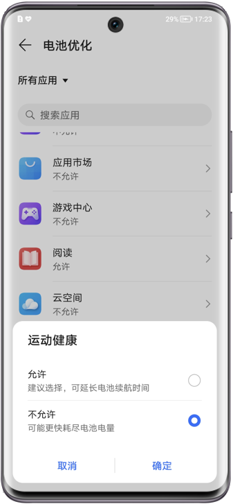 进入设置,搜索进入电池优化,点击小三角形,选择所有应用,找到该应用,设置为不允许。