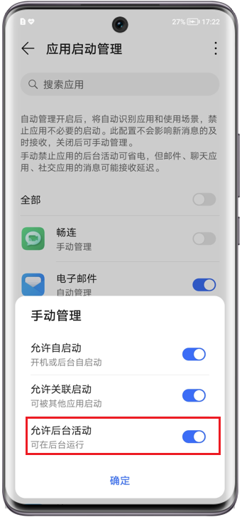 进入设置搜索进入启动管理/应用启动管理,关闭应用的自动管理开关,并在弹框中勾选允许后台活动开关,点击确定,即可避免被清理。