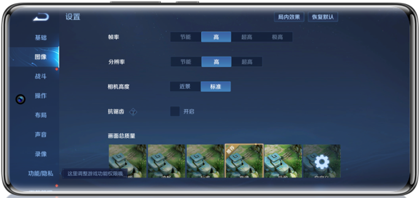 - 例如:玩王者荣耀游戏时,建议您适当调高游戏中的帧率设置,节能/高/超高/极高的帧率设置会分别带来30/60/90/120帧的游戏体验,但帧率设置越高,设备更易发热,请按需调整设置。此外,不同设备会有适配不同的帧率设置,请以实际设备显示为主。