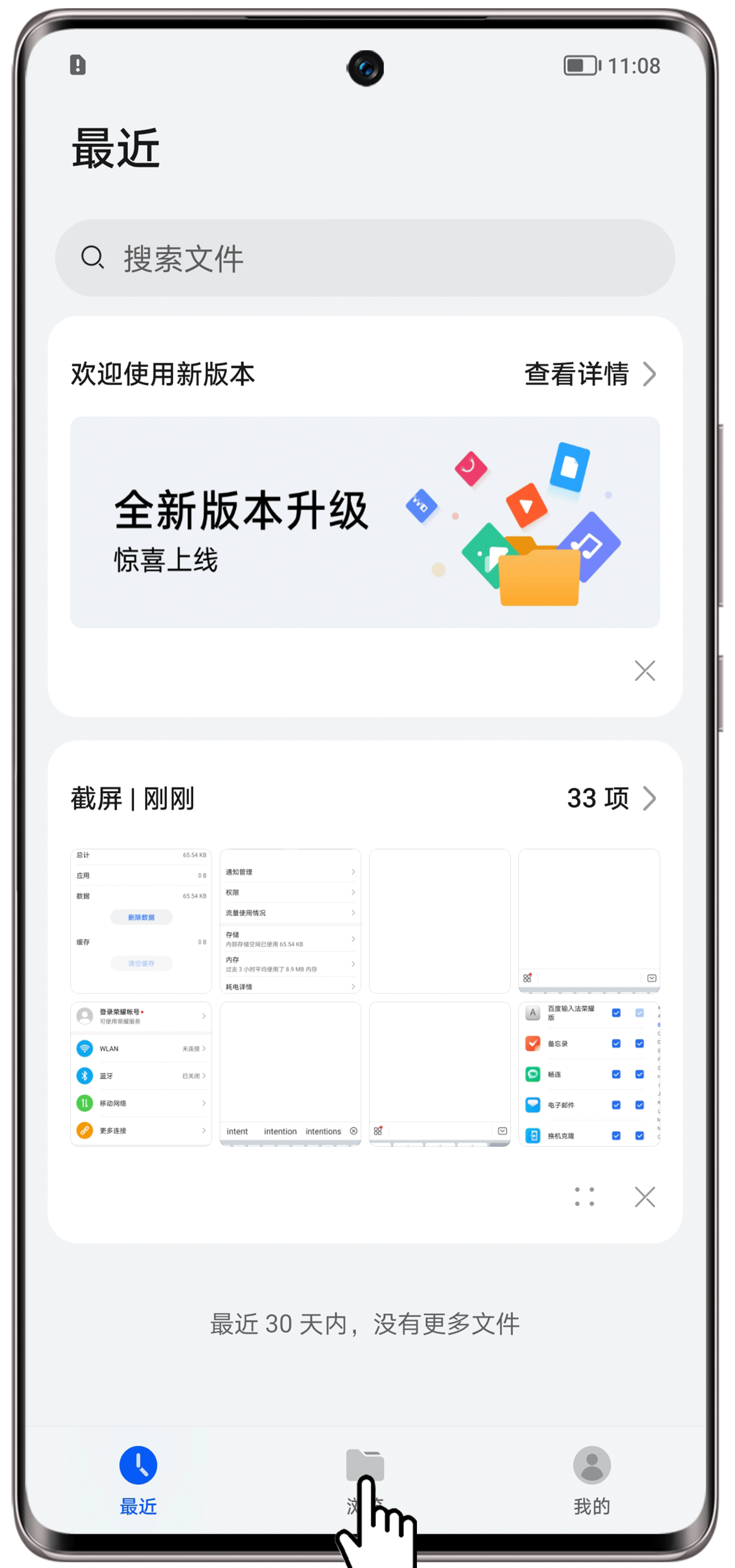 请您在结束通话后等待 1 分钟,再去录音机查看是否已生成通话录音文件。您也可以在文件管理中查看: