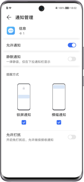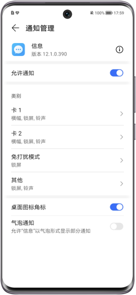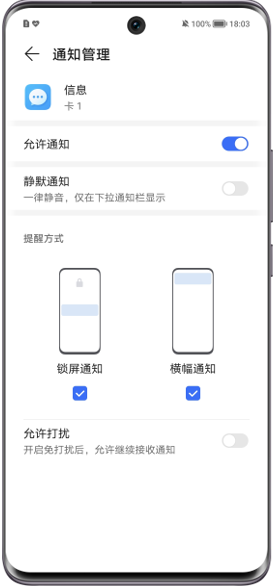进入设置,搜索并进入应用管理,找到信息,点击通知管理/通知,选择类别中对应的卡1/卡2,打开横幅开关。