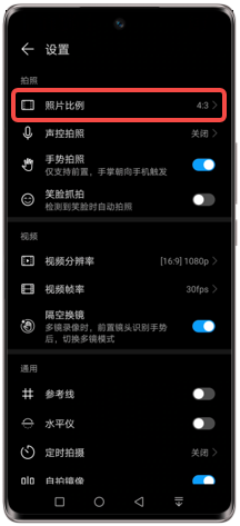 您可以在拍照界面点击设置图标,点击照片比例,设置您需要的照片比例。
