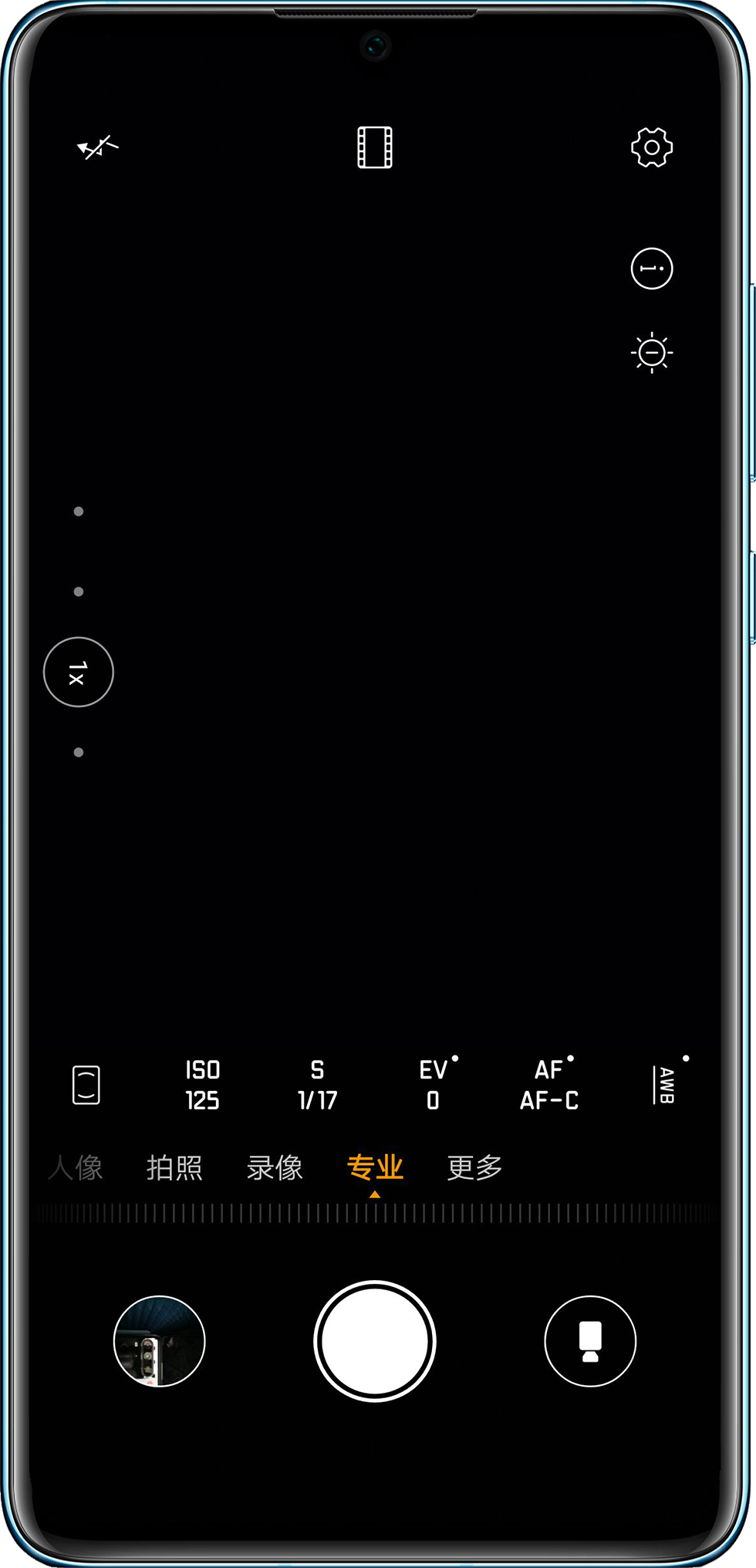 - 如果周边的环境光线太暗,建议在相机中通过右滑屏幕进入模式/更多界面,点击专业拍照,在屏幕下方的参数设置中调整曝光时间(S)和 ISO,获得理想亮度的照片,建议优先调整曝光时间,并且 ISO 设置尽量不要超过 200。