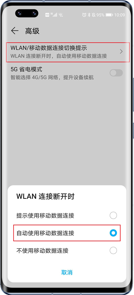 请您在设置中搜索“移动数据连接切换提示”,进入WLAN/移动数据连接切换提示,选择自动使用移动数据连接。之后就可以在WLAN断开后自动连接到数据业务。