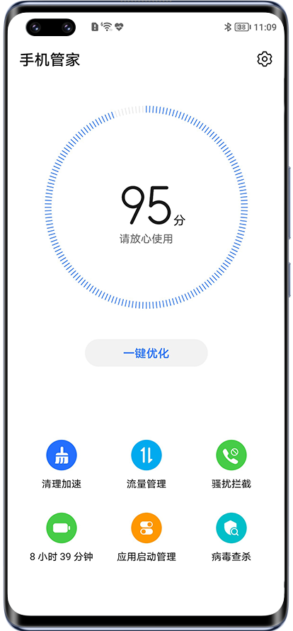 可以使用手机管家/系统管家界面的一键优化功能,实现省电续航。