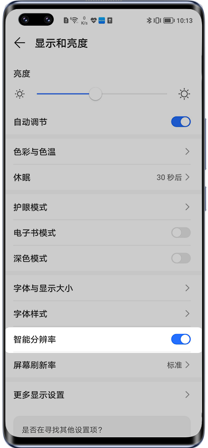 进入设置,在上方搜索智能分辨率,点击进入显示和亮度设置界面,开启智能分辨率。