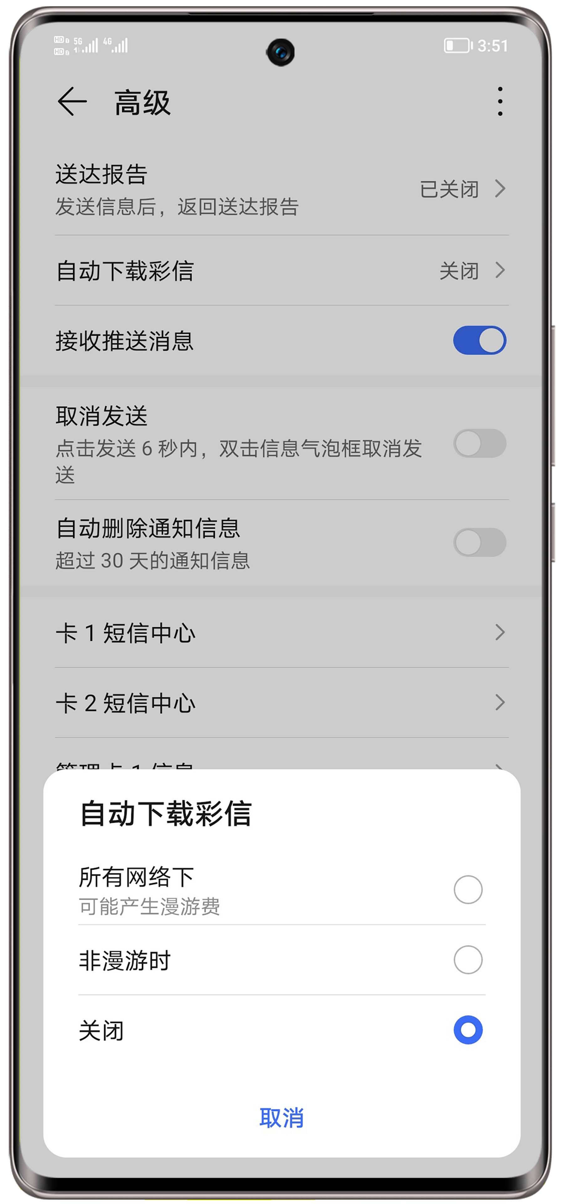 ,进入,然后将设置为 。选择后,当副卡收到彩信时将先收到一条通知,您可以在主卡不上网的情况下手动点击下载彩信。