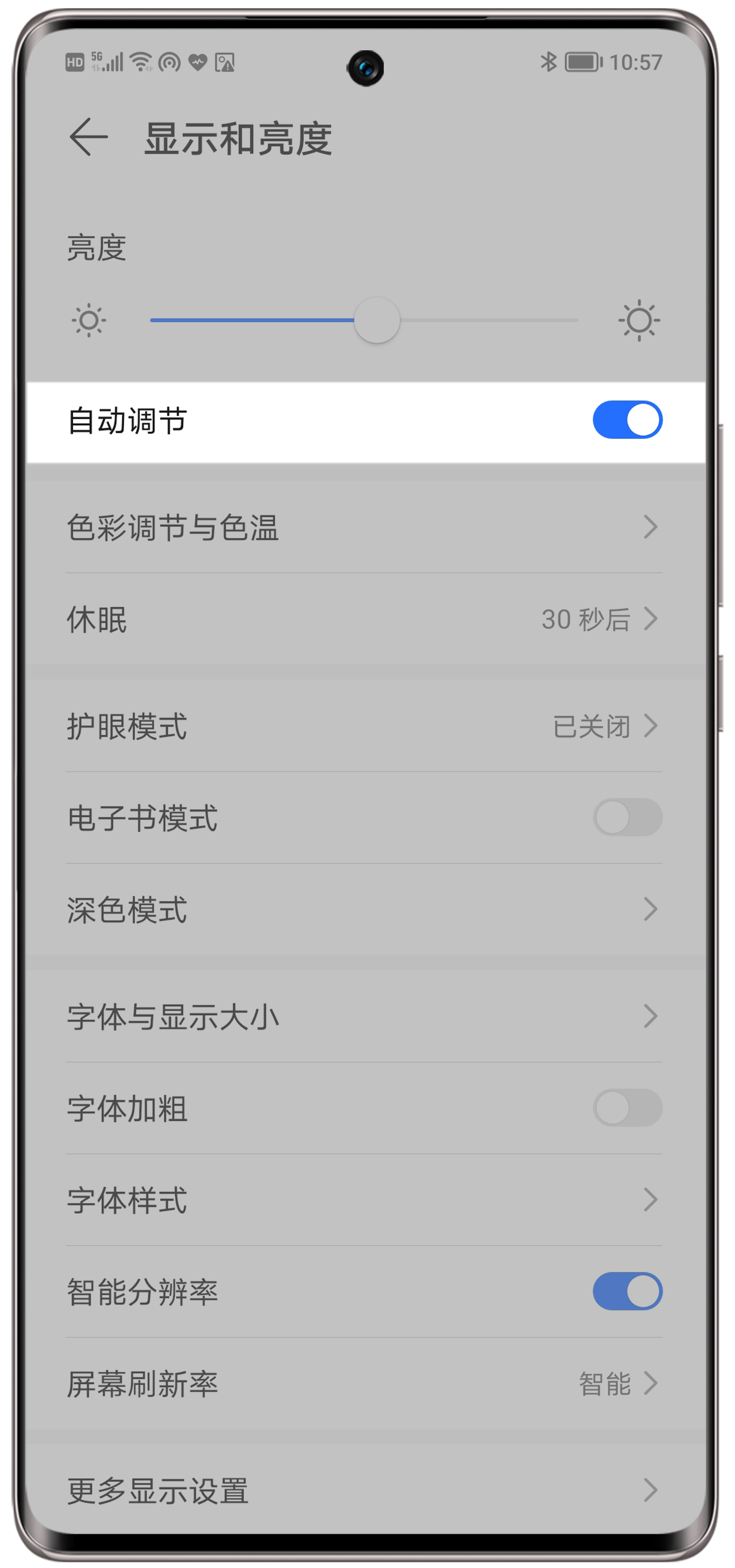 请您关闭或开关并重新打开,如果您有手动拖动过亮度条,系统会将拖动位置作为用户喜好记录下来,环境光变化时,算法会根据您的偏好做亮度补偿,因此屏幕亮度会接近您手动调整的亮度,重新打开开关可清除您的喜好记录。