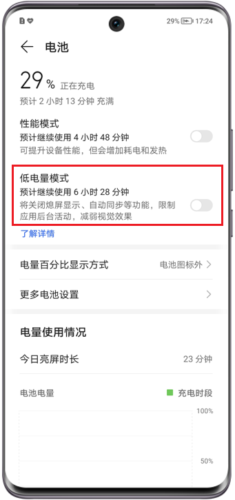 请您进入,关闭省电模式、超级省电或低电量模式的开关。