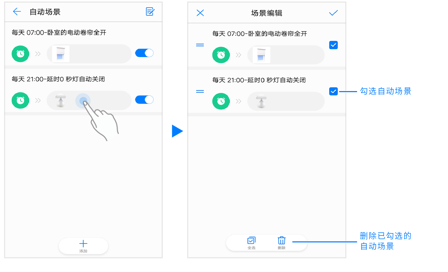 ,进入自动场景管理页面,长按某个自动场景,进入批量删除页面,您可以同时删除多个自动场景(如图)。