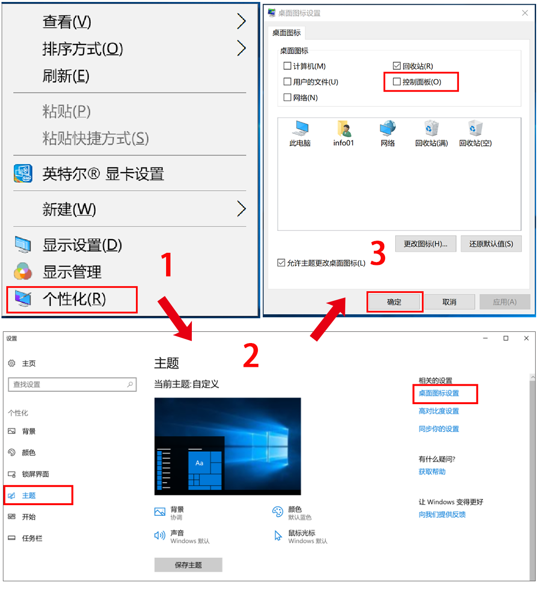 方法三:右击桌面空白处,选择个性化 > 主题 > 桌面图标设置 ,勾选控制面板,点击确定。这样就可以将控制面板图标添加到桌面再打开。