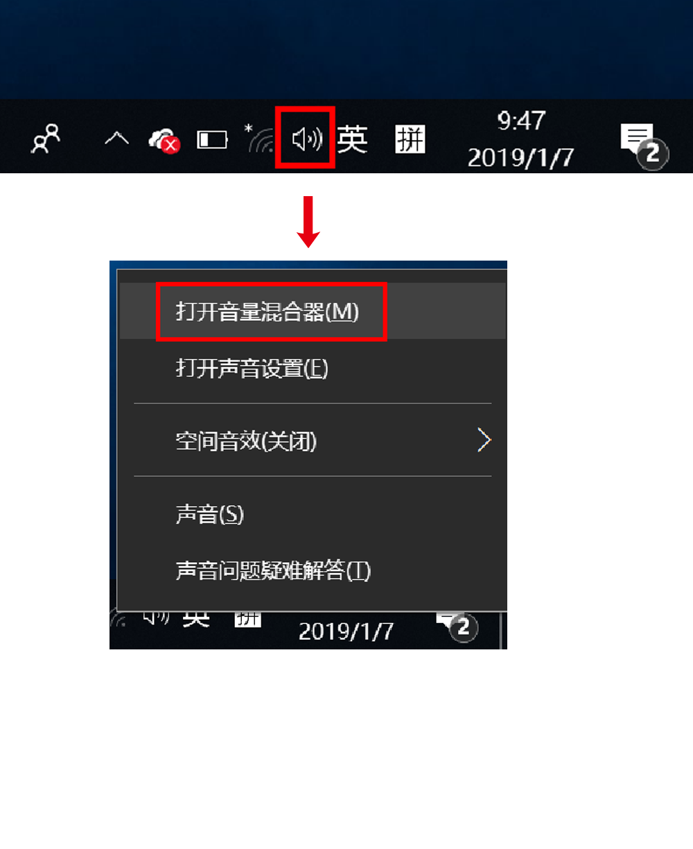 右键点击任务栏小喇叭图标,选择“打开音量混合器”(部分系统版本中显示为“打开音量合成器”)。