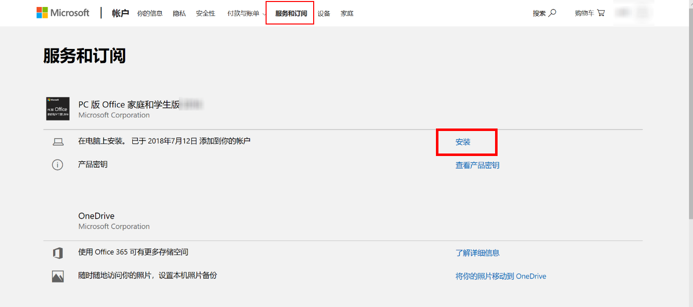 - 使用您激活Office产品的微软帐号登录微软官网(www.office.com/myaccount),点击“服务和订阅”,点击 Office 产品后方的“安装”按钮(若您的帐户下有多套Office产品,请按激活时间确认找到准确的Office产品)。