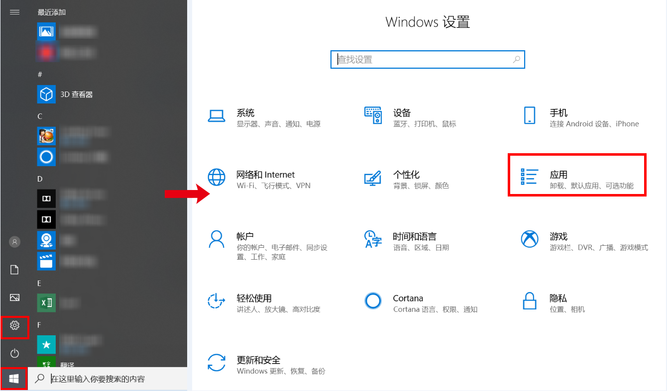 - 在您的 Office 激活后,点击 Windows 图标 > 设置图标,选择“应用”。